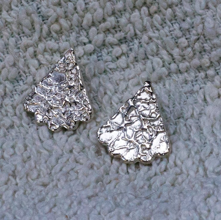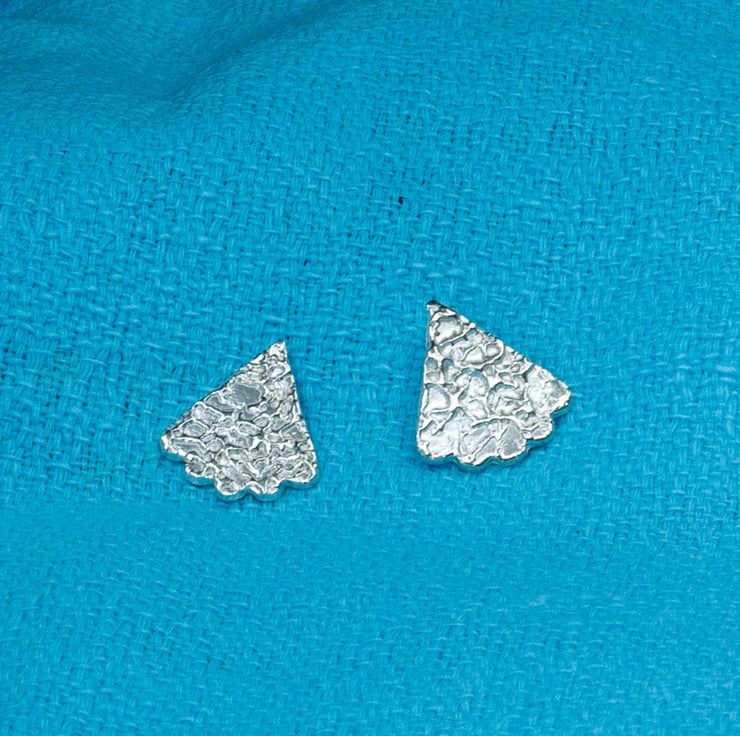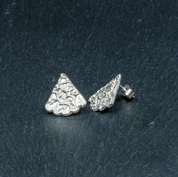 These stud earrings, made using the silver clay technique, are in in the shape of a fan and are embossed with a random pattern.