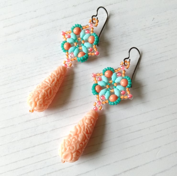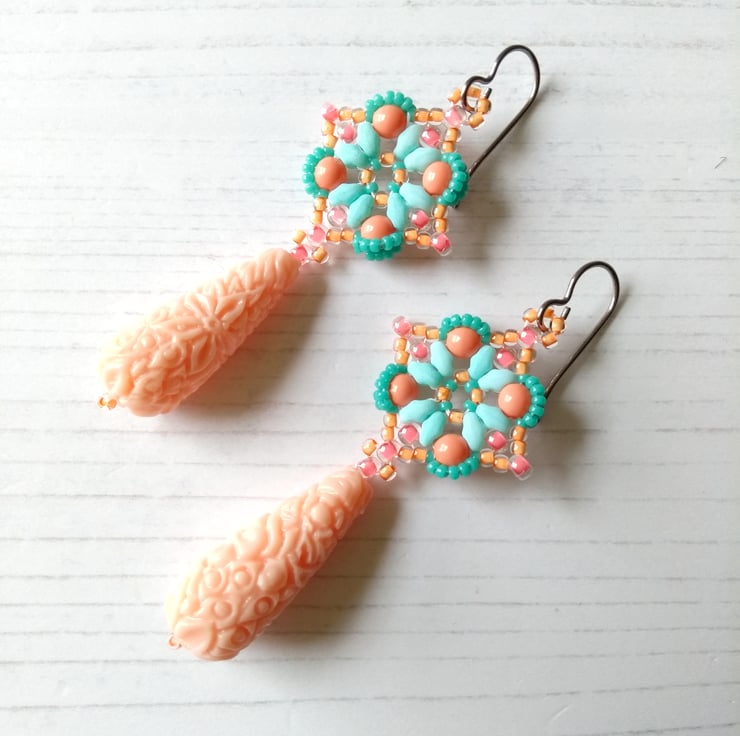 The earrings consist of a resin teardrop bead in pale coral, teamed with a hand-beaded square in apricot, coral and turquoise seed beads plus glass pearls also in a peachy-apricot colour, all strung together on antique silver-coloured hypo-allergenic titanium earwires.