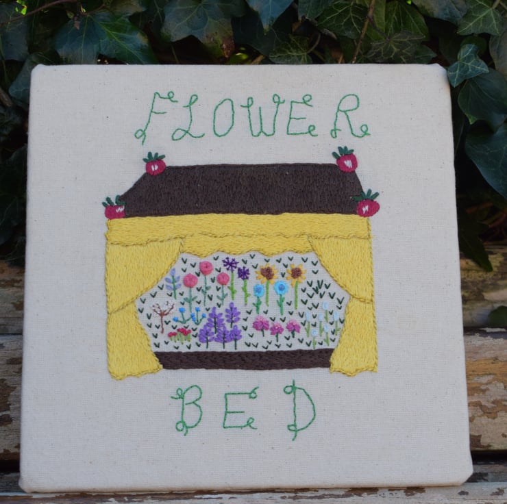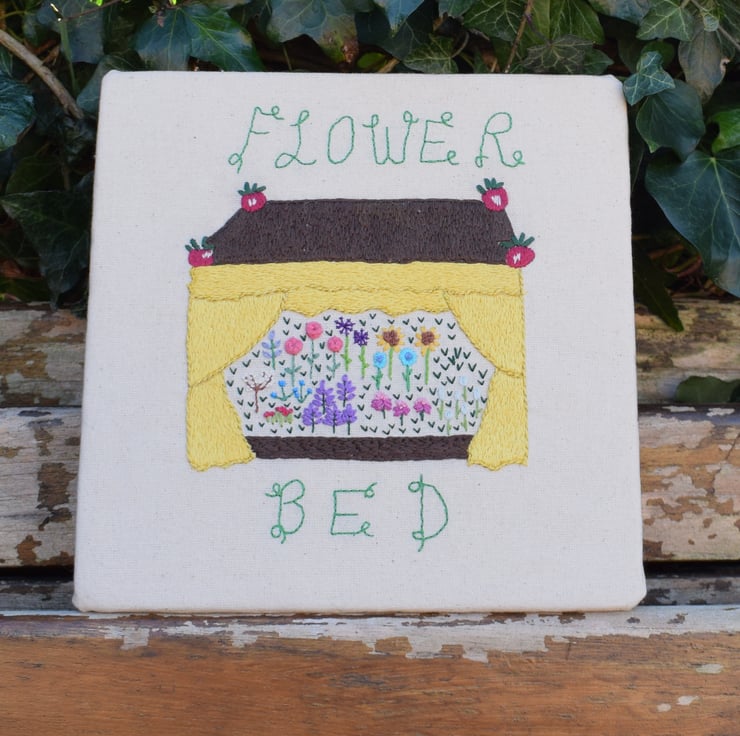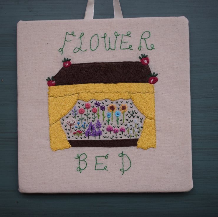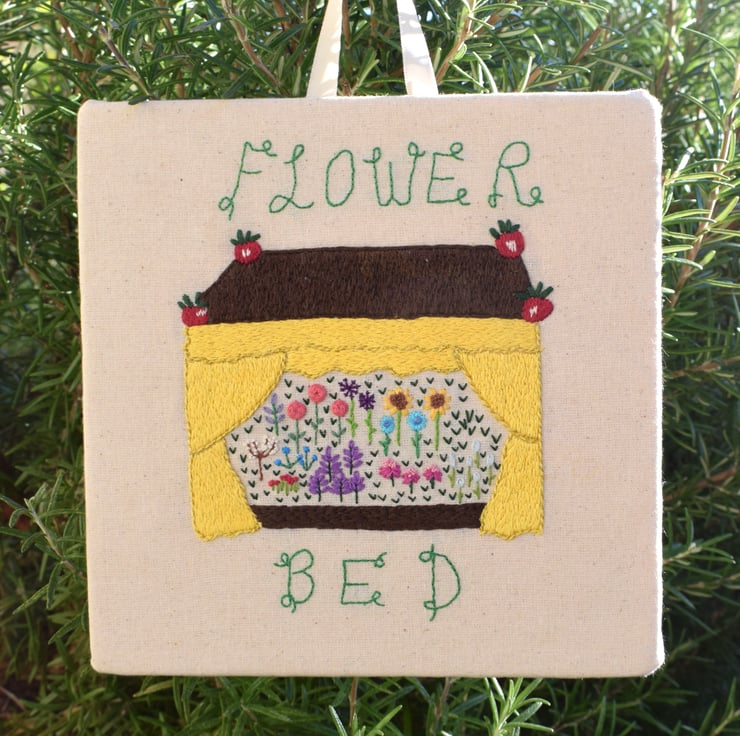 This luxurious four poster bed is full of charming flowers, creating a "flower bed. The bed and flowers have been hand embroidered onto a natural cream canvas and placed onto mounting board, creating a picture 19cm x 19 cm. The picture has been backed with more cream canvas and a small piece of cream ribbon attached to hang the picture up with.
