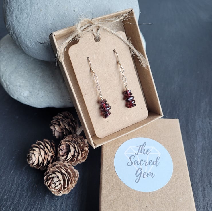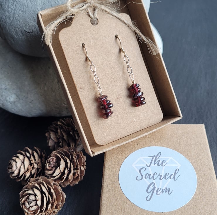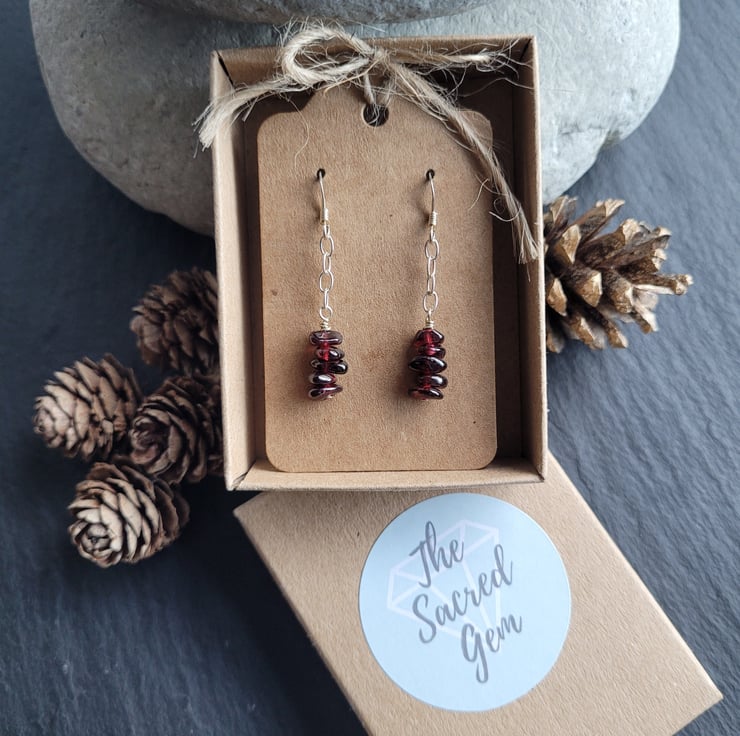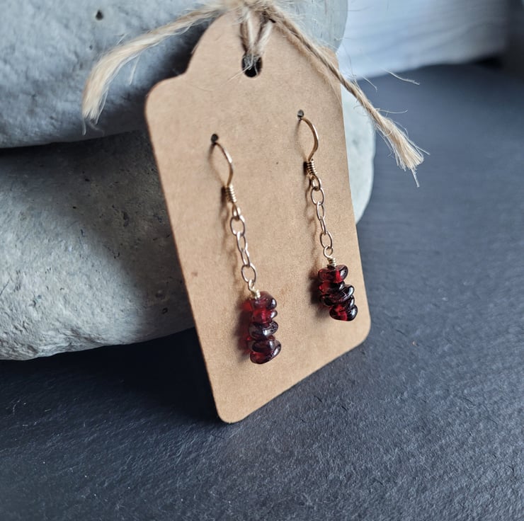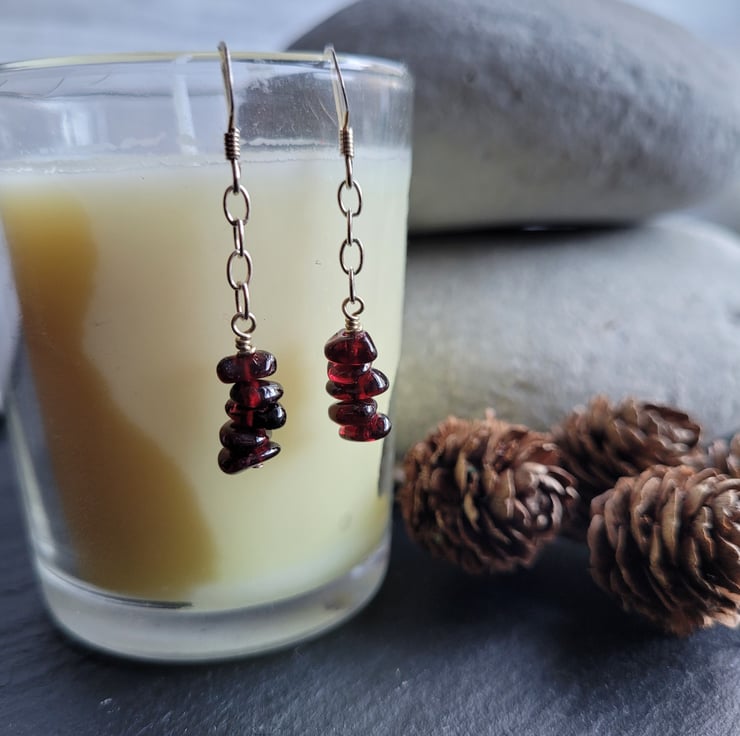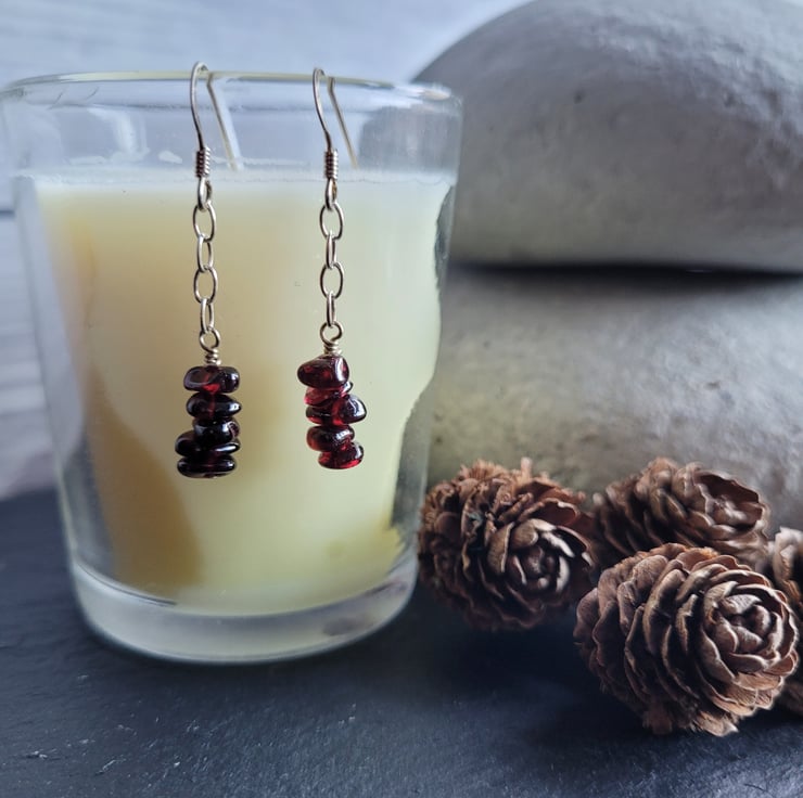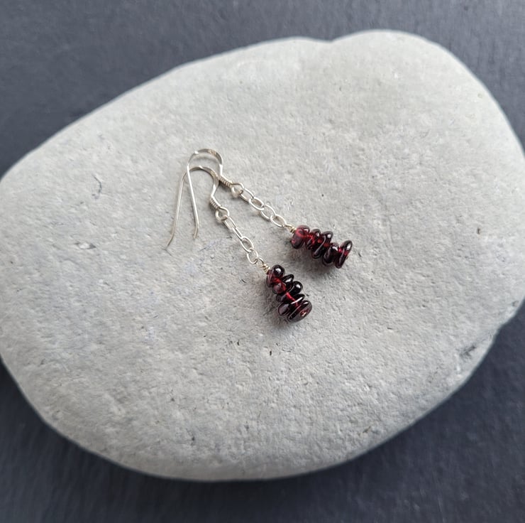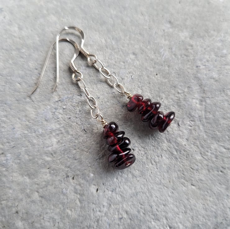 The smooth garnet chip beads in these earrings are a beautiful, deep, rich red colour. They hang in a little cluster from a length of sterling silver chain. All the metal elements in these earrings are sterling silver and they measure 3cm in length from the ear wire.