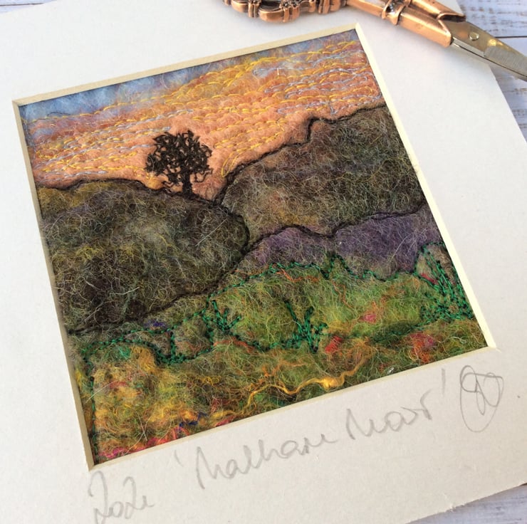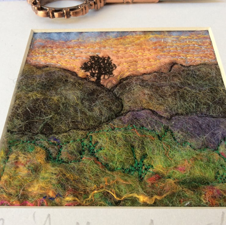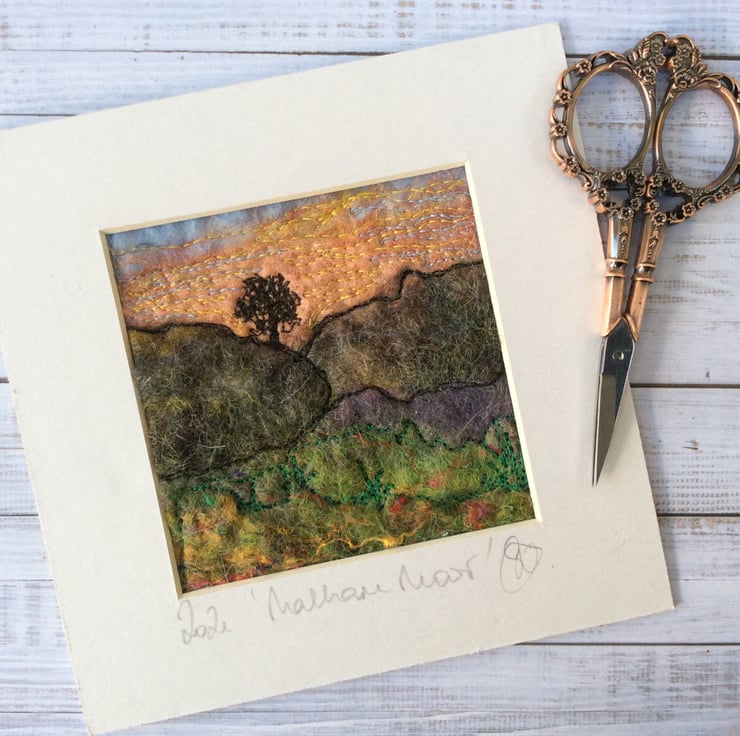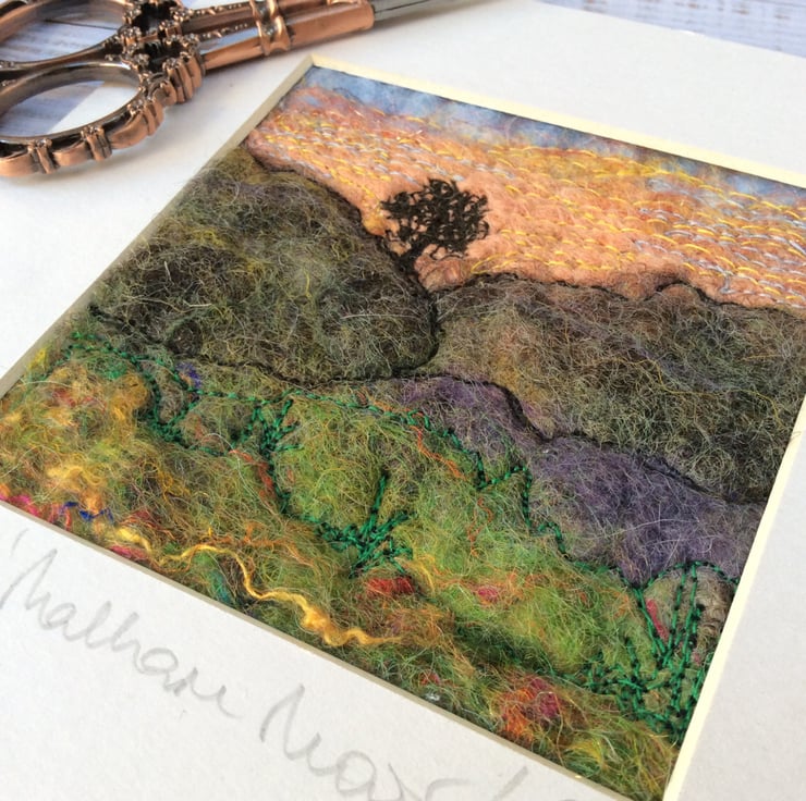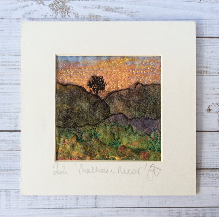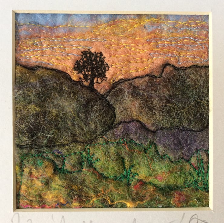 This delightful little landscape shows a sunset silhouette tree on Malham Moor. It’s embroidered onto wet felting and made from merino wool, nepps and recycled silk with free motion embroidery, and it comes mounted. The artwork measures 14 x 10.5cm. The mount measures 15 x 15cm and the mount window measures 9.5 x 9.5cm.