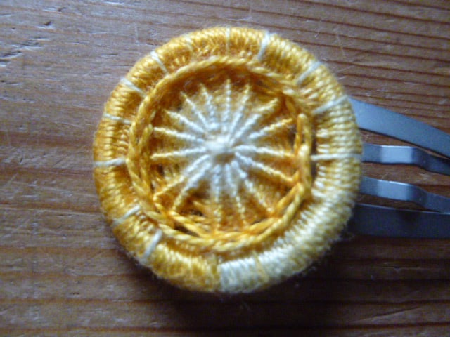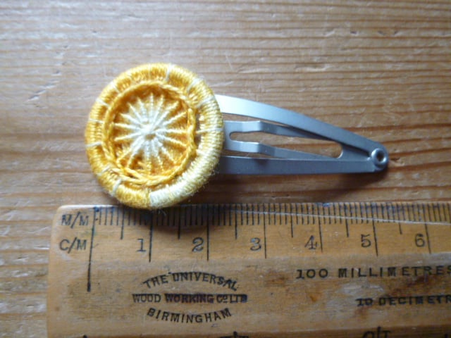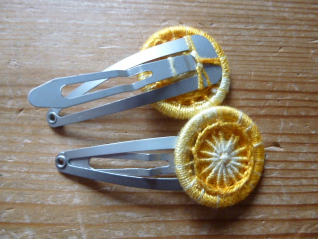 This pretty pair of Dorset button hair clips feature cross wheel buttons made with a variegated cotton thread in shades of sunshine yellow. The buttons are worked on a 25mm brass ring and are fixed to the simple snap closing hair clip as part of the construction of the button.