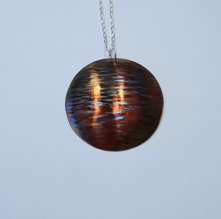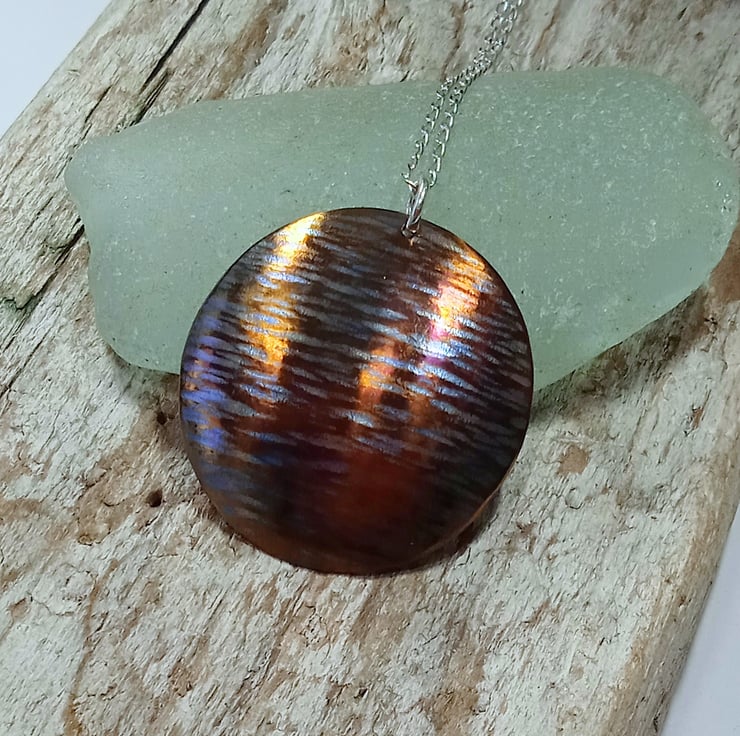This titanium pendant necklace displays a range of attractive shades which really come to life when it catches the light.