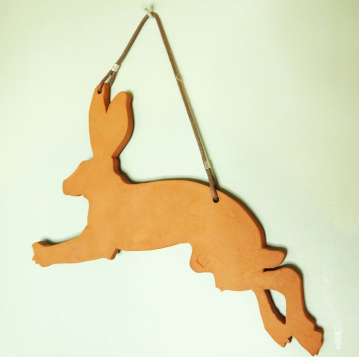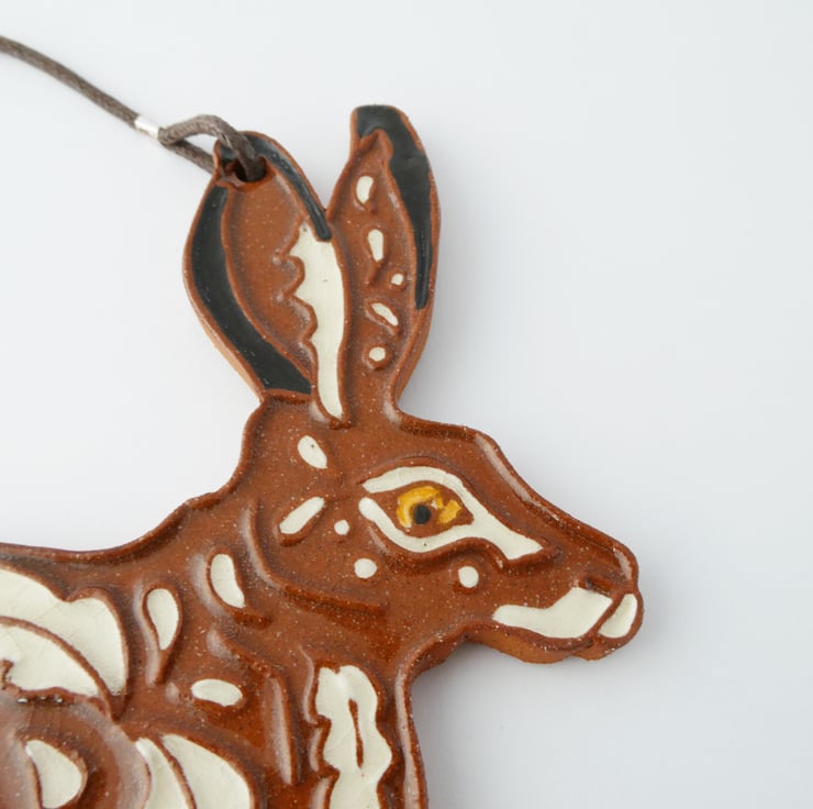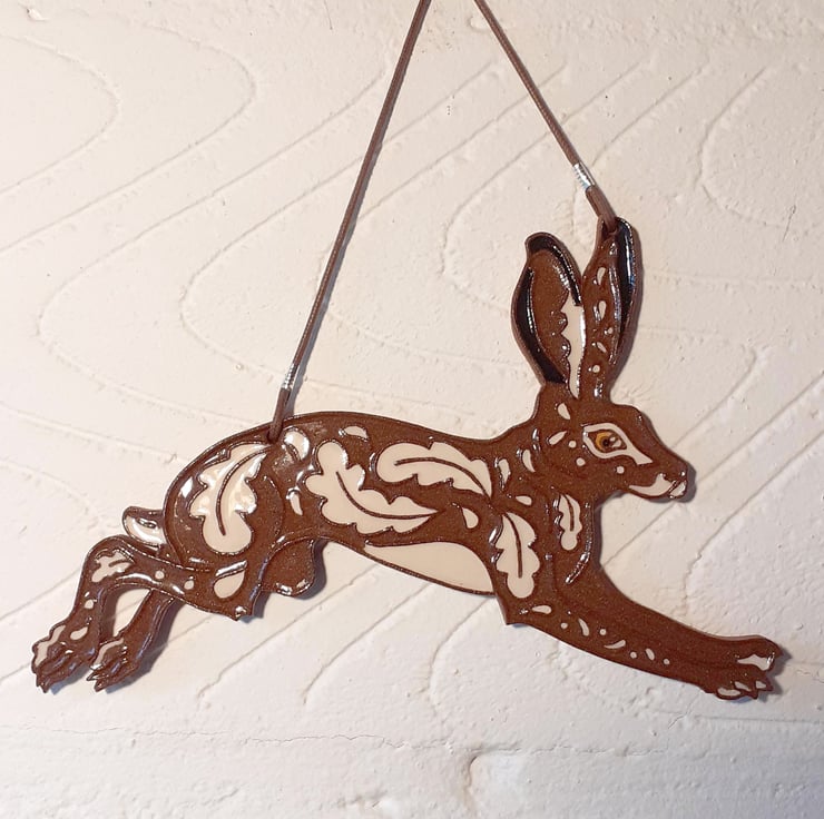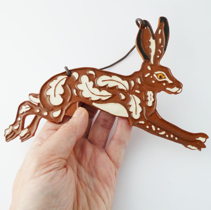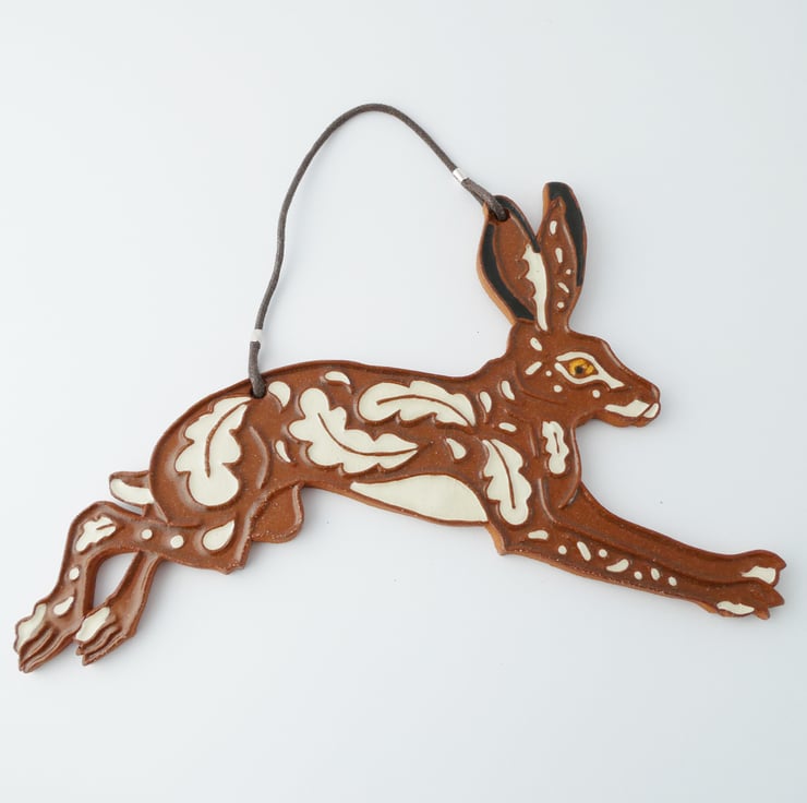 Decorative ceramic hanging wall plaque in the shape of a leaping hare. Made from a terracotta clay it has a leaf inspired relief pattern that is highlighted with black and white decorating slips. The plaque is hung from cotton cord. Each one is cut out and decorated by hand.