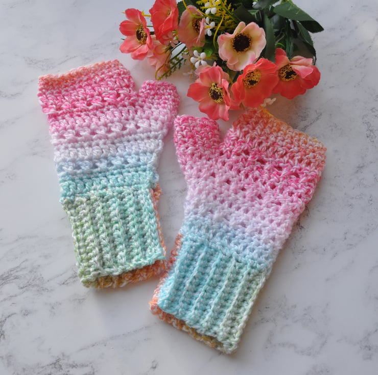 I have hand crocheted these gorgeous fingerless mittens to fit girls and ladies in a luxury soft coloured yarn using my very pretty pattern. The cuffs are a really good length to keep your wrists warm too. I've have painstakingly made sure the colours are an exact match for the pair.