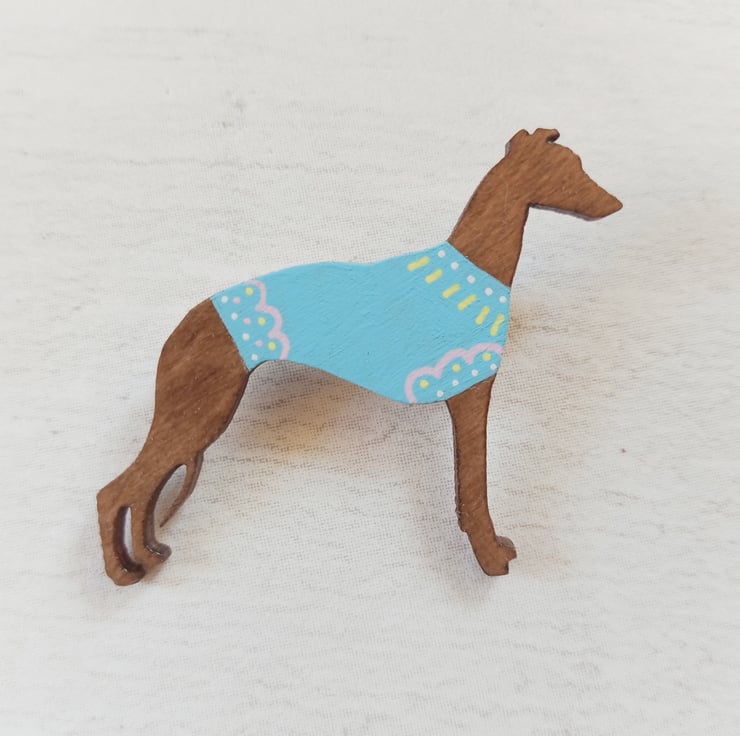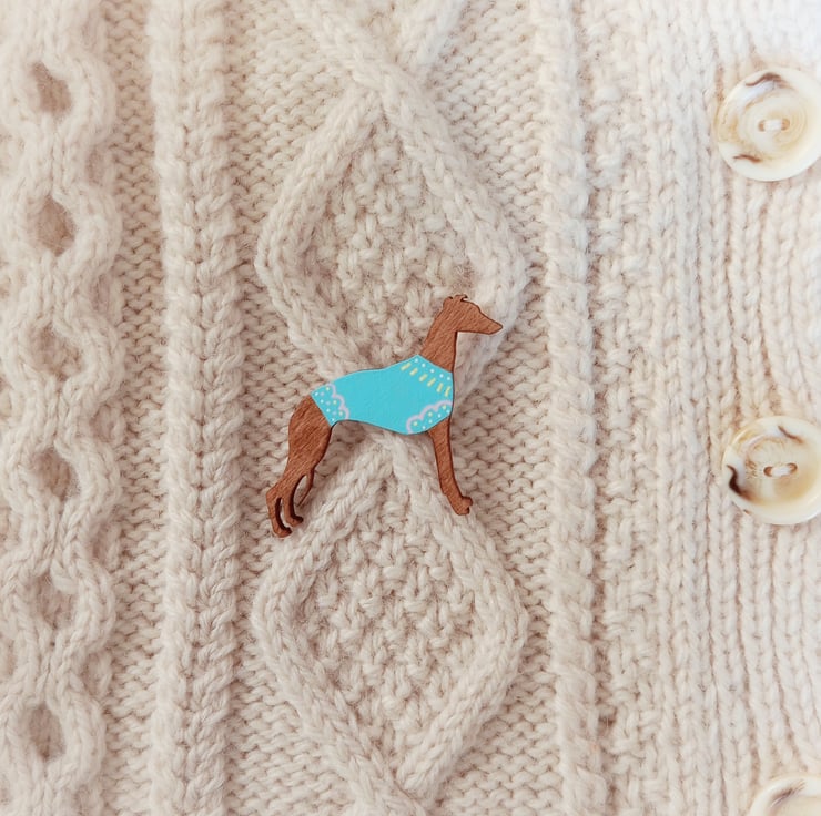 This wooden brooch has been stained and painted by hand, and measures approx 5cm x 5.8cm; it has a metal badge fastening on the back.