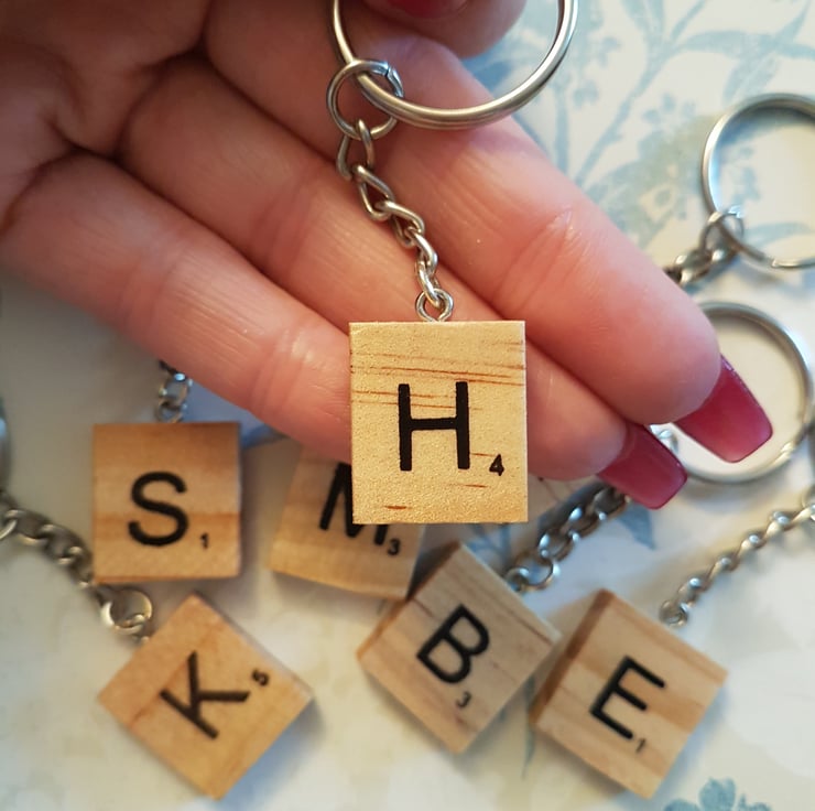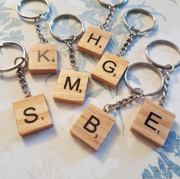 Wooden scrabble tile initial keyring- sanded and glazed- alphabet letter- geek gift keychain gift- letter initial