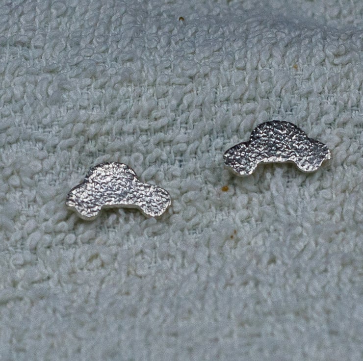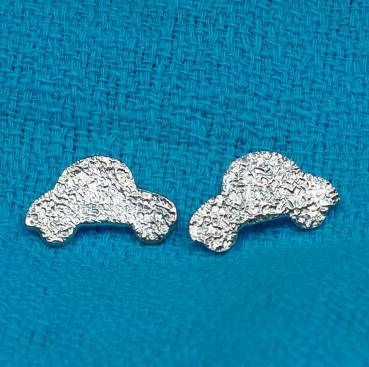These stud earrings, hand made using the silver clay technique are in shape of a car with a fine texture on them. They measure approximately 18mm from bumper to bumper.