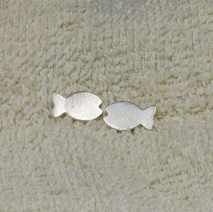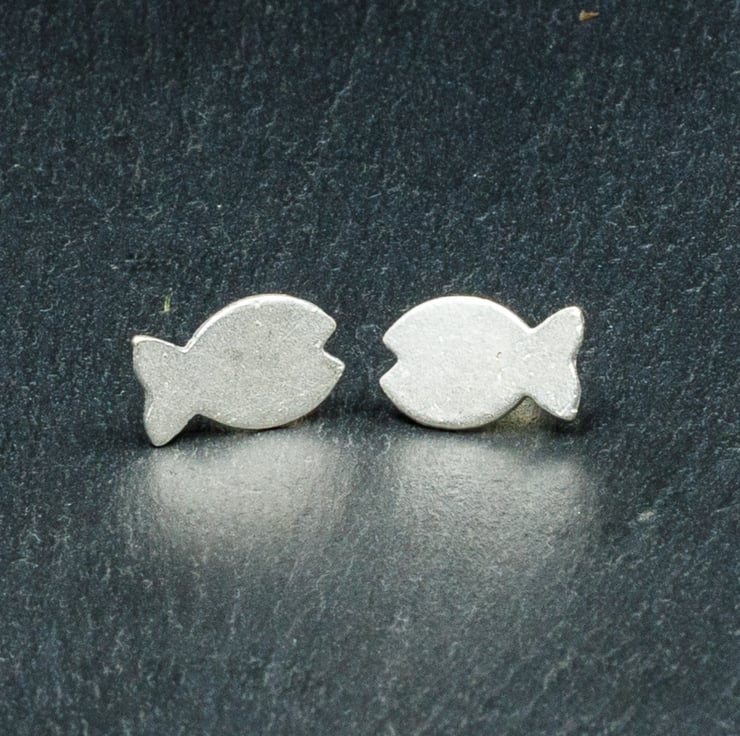 These fish stud earrings were hand cut from sterling silver sheet and measure 15mm approximately from mouth to tail.