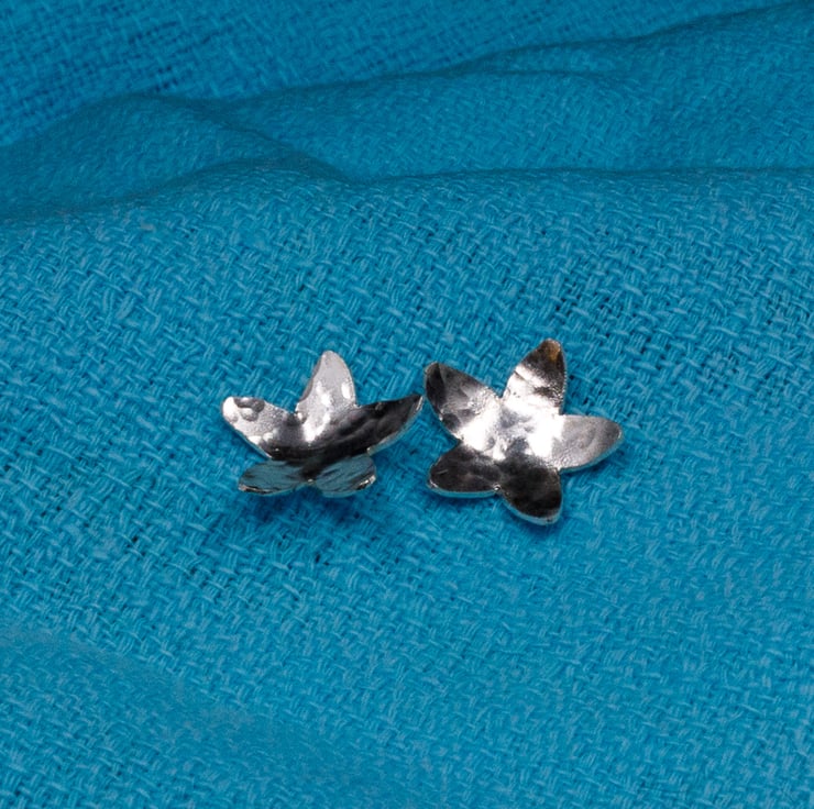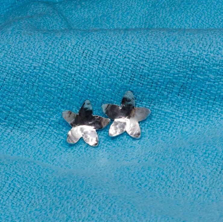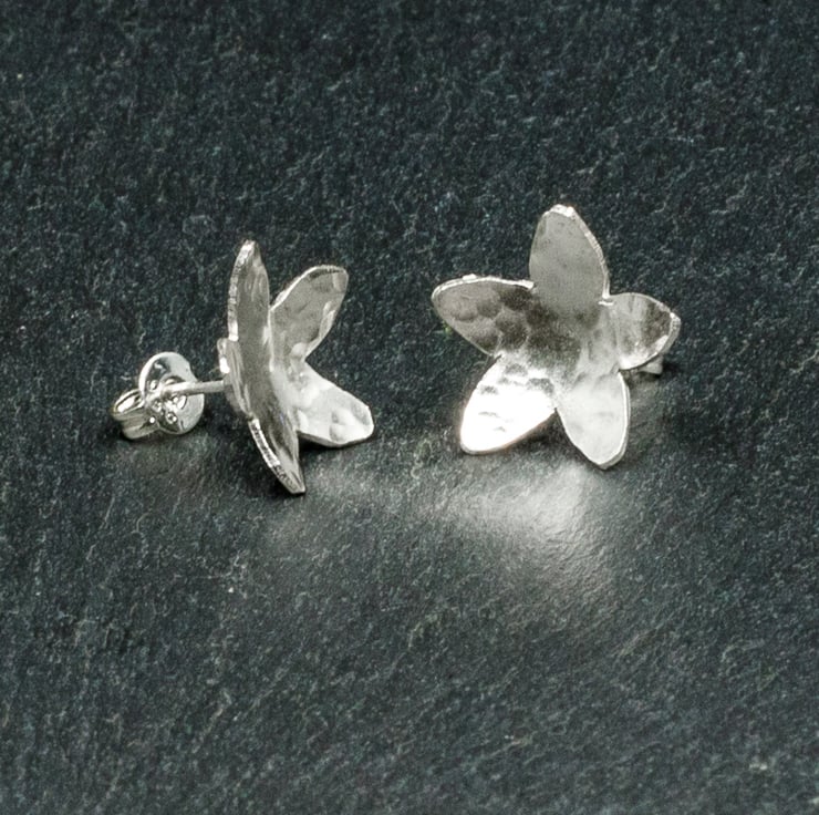 These stud earrings, hand cut from sterling silver sheet are in the shape of a flower. They have a light hammered texture and are slightly domed. They measure approximately 15mm at the widest point.