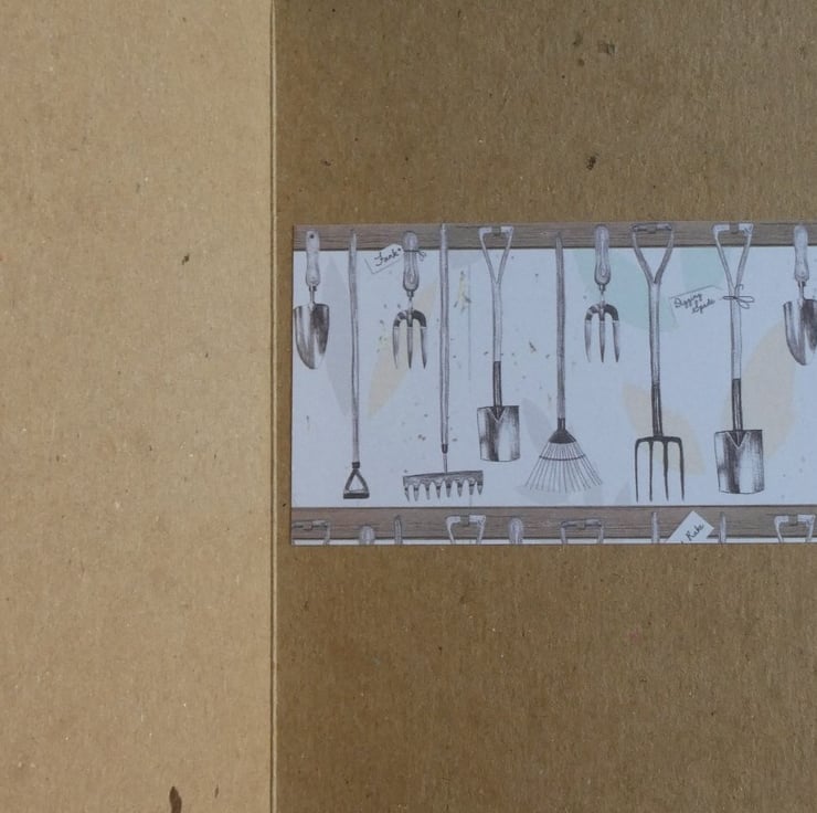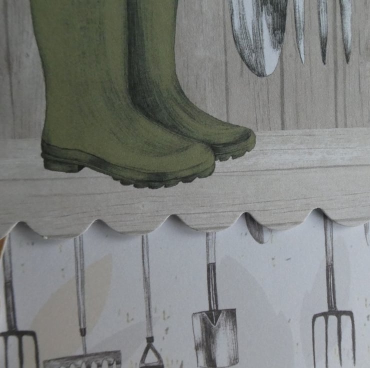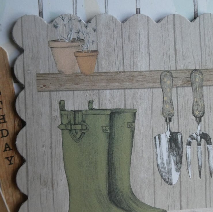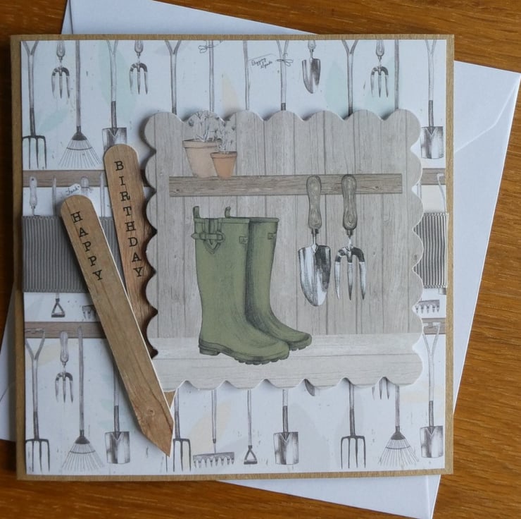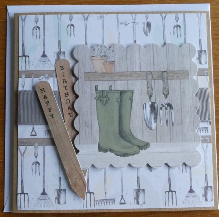 Ideal for a keen gardener this card has a background of garden tools hanging from wooden rails. A ribbon has been wrapped around the background paper and a scalloped square topper showing a pair of green wellingtons, a fork and trowel and some plant pots added with foam pads to raise it from the card front.