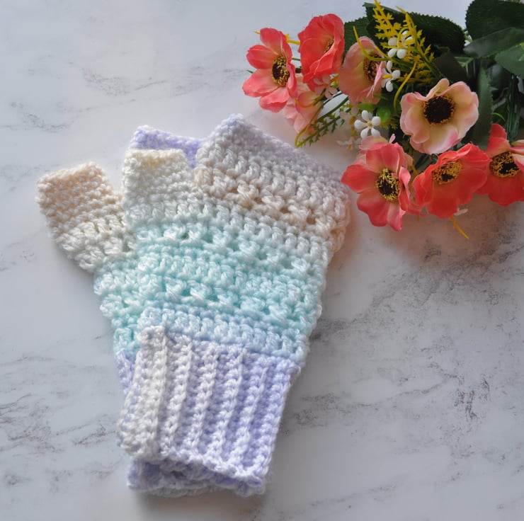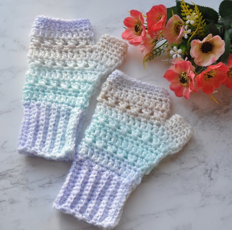 I have hand crocheted these gorgeous finger less gloves to fit girls and ladies in a luxury soft pastel ombre coloured yarn using my very pretty pattern. The cuffs are a really good length to keep your wrists warm too. I've have painstakingly made sure the colours are an exact match for the pair.