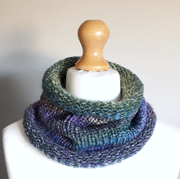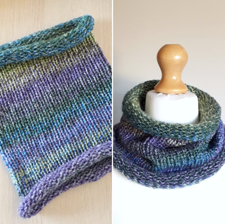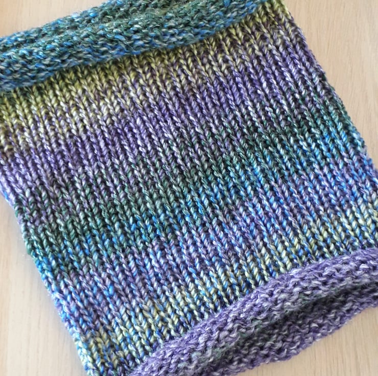 This neck warmer has been knitted from beautifully soft acrylic yarn in shades of purple, blue and green.