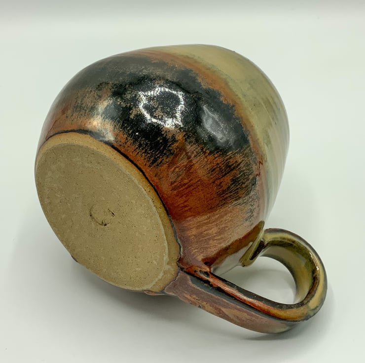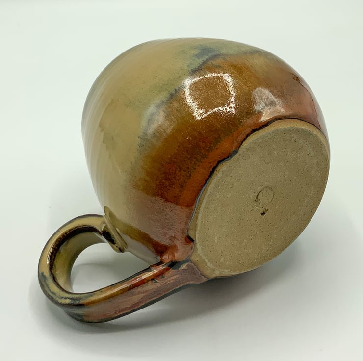 Wonderfully tactile and generously proportioned mug, absolutely ideal for something hot on a cold day. A wheel thrown stoneware mug coloured with a fluid greenbrownblue glaze inside and out but with a rising metallic copper on the exterior.
