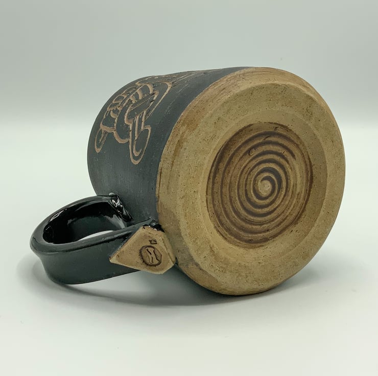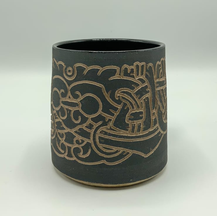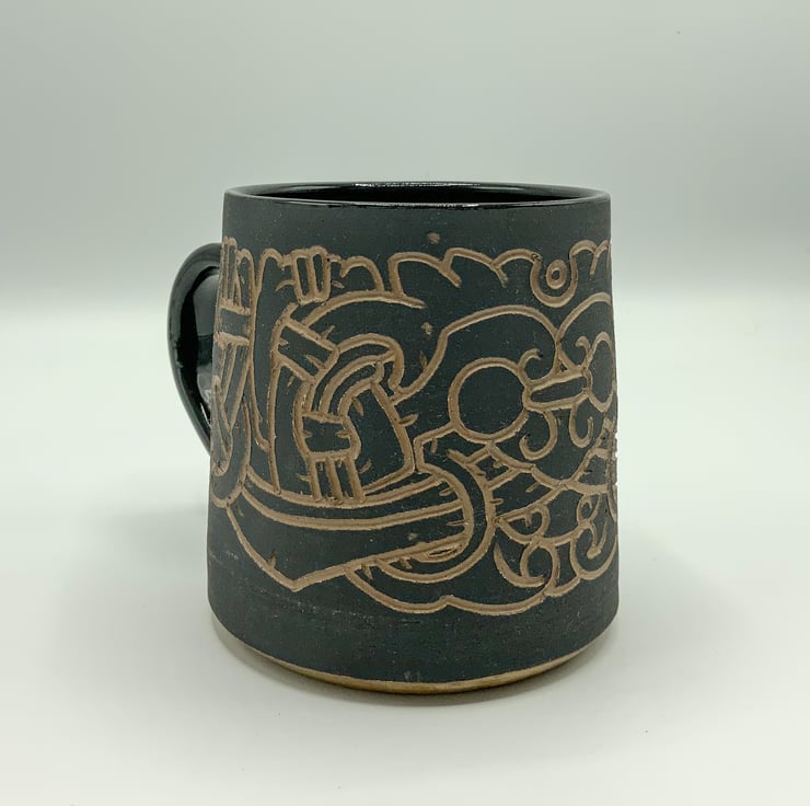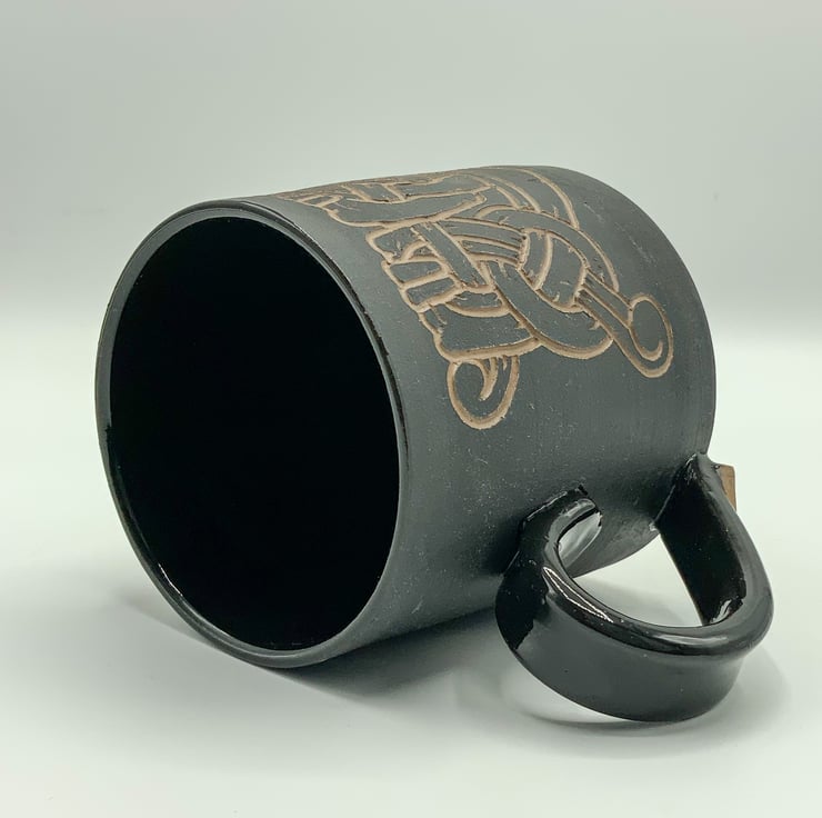 Carved in to a matt black exterior and glazed with a high gloss black on the inside and the handle.
