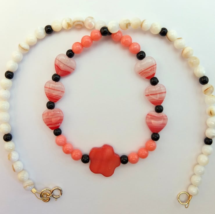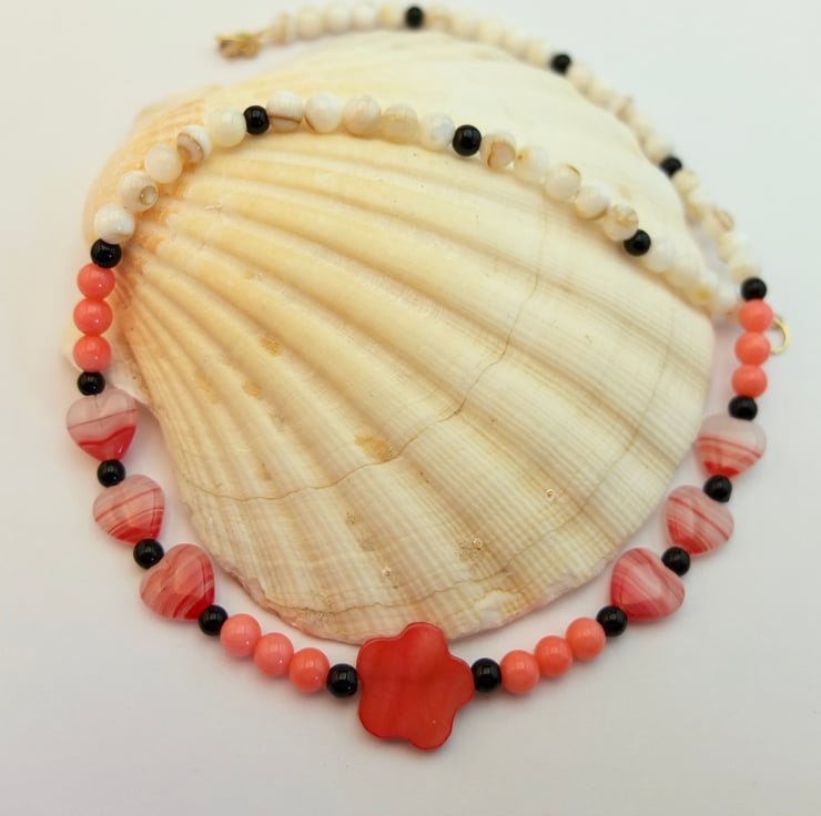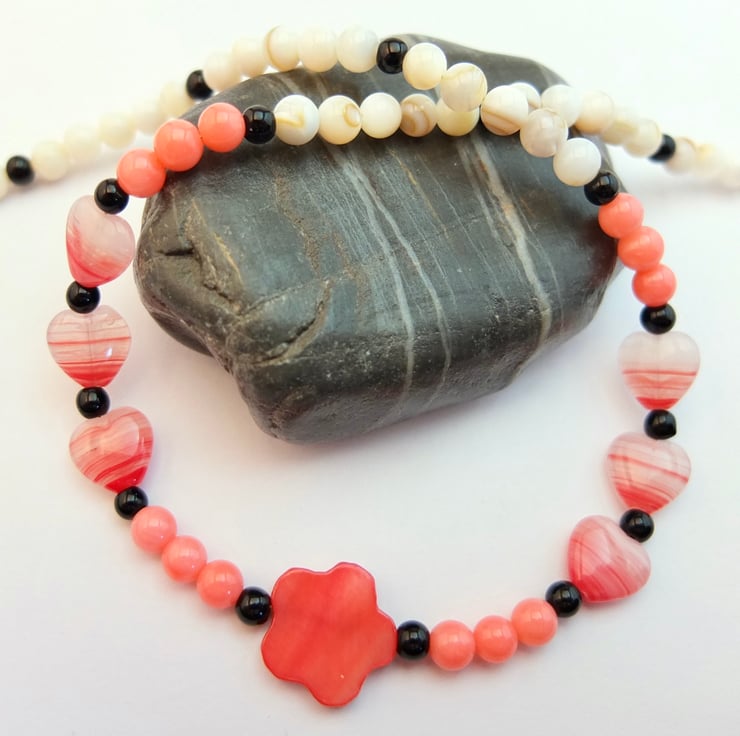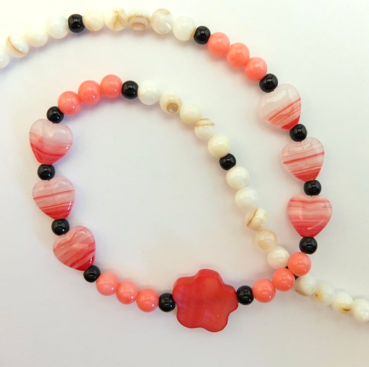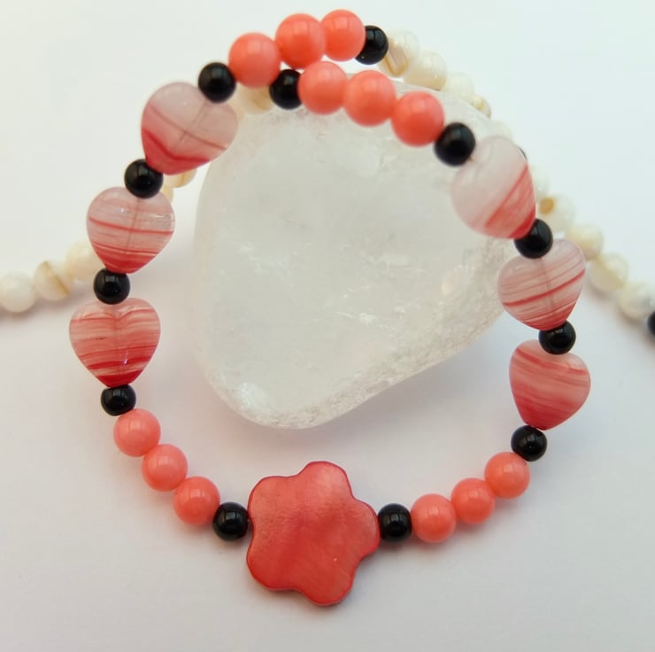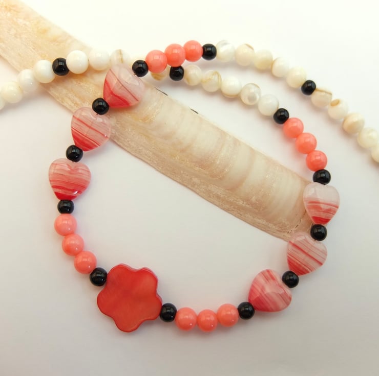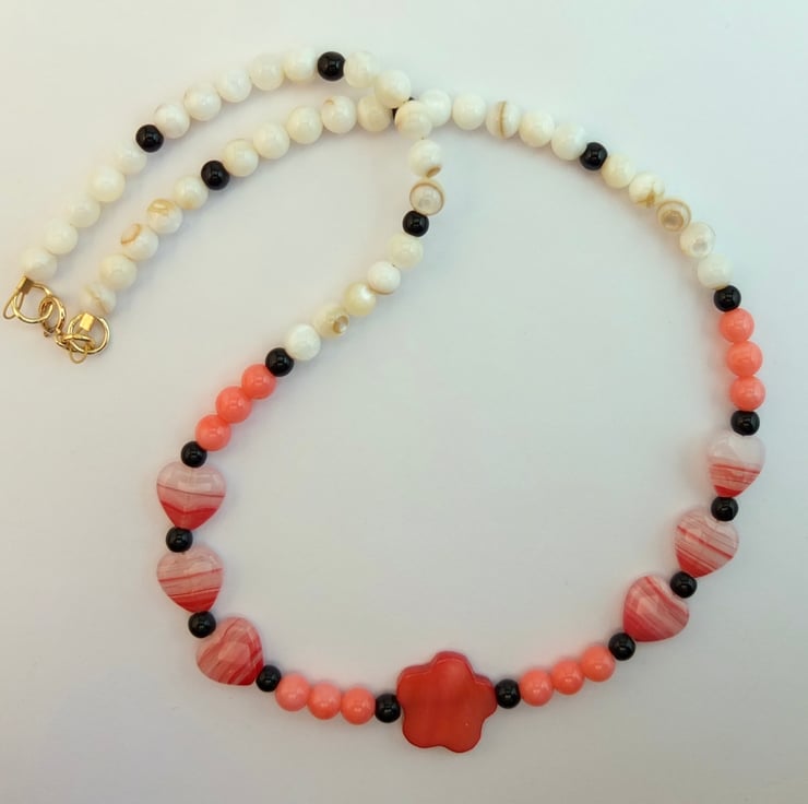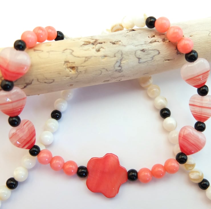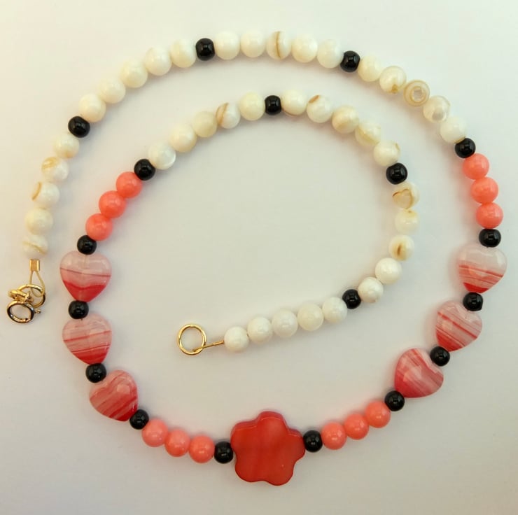 In the centre of this pretty, romantic necklace is a 15mm mother of pearl flower set between 4mm black onyx and 5mm salmon-pink coral beads.