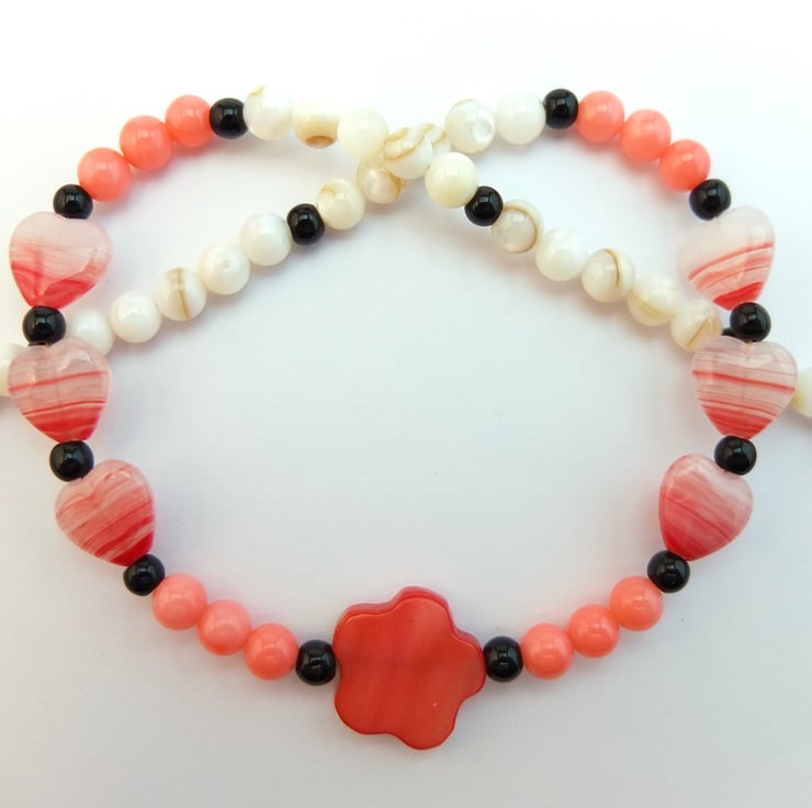 The flower bead is a deep red/pink on one side, and a paler pink on the other, and the glass hearts have different patterns on each side, so can be worn either way round.