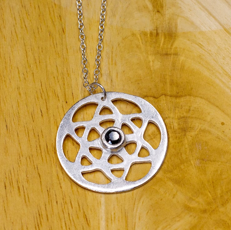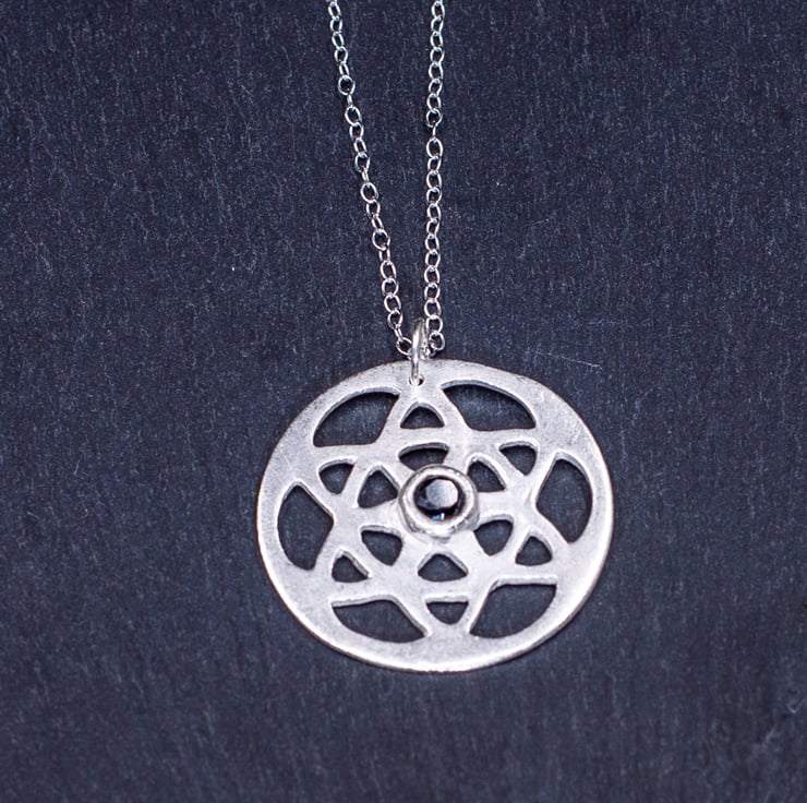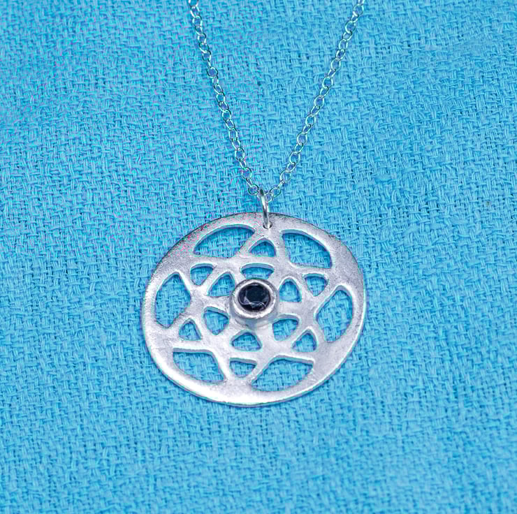 This pendant was hand made using silver clay.The circle was pieced out by hand and has a black zircona stone set in the centre.