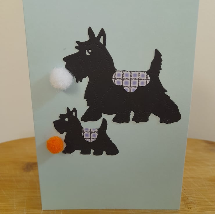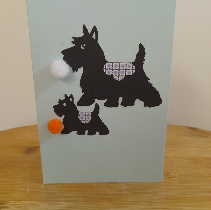 CUTE HANDMADE SCOTTIE DOGS GREETING CARD, WHICH HAS BEEN MADE USING GOOD QUALITY CARD 4" X 6" WHICH COMES WITH AN ENVELOPE AND IN A SEALED CELLOPHANE BAG. THE CARD COMES BLANK FOR YOUR OWN MESSAGE.