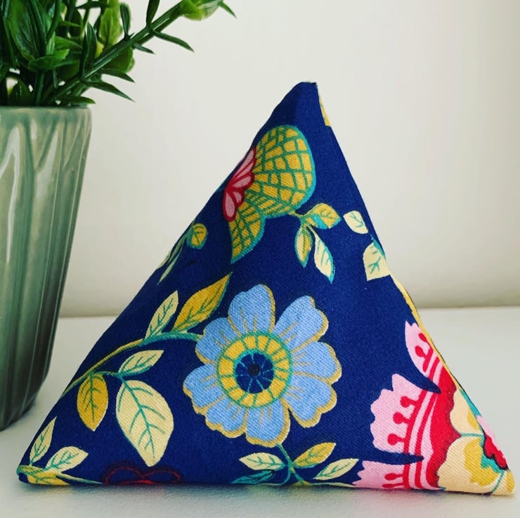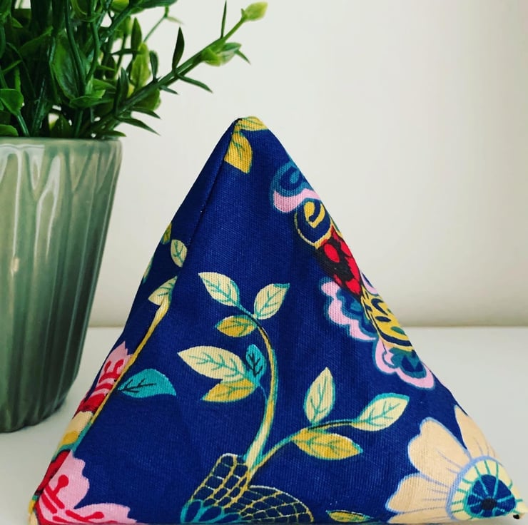 This little pyramid has been made from a gorgeous cotton fabric and partially filled with dried rice (uncooked)