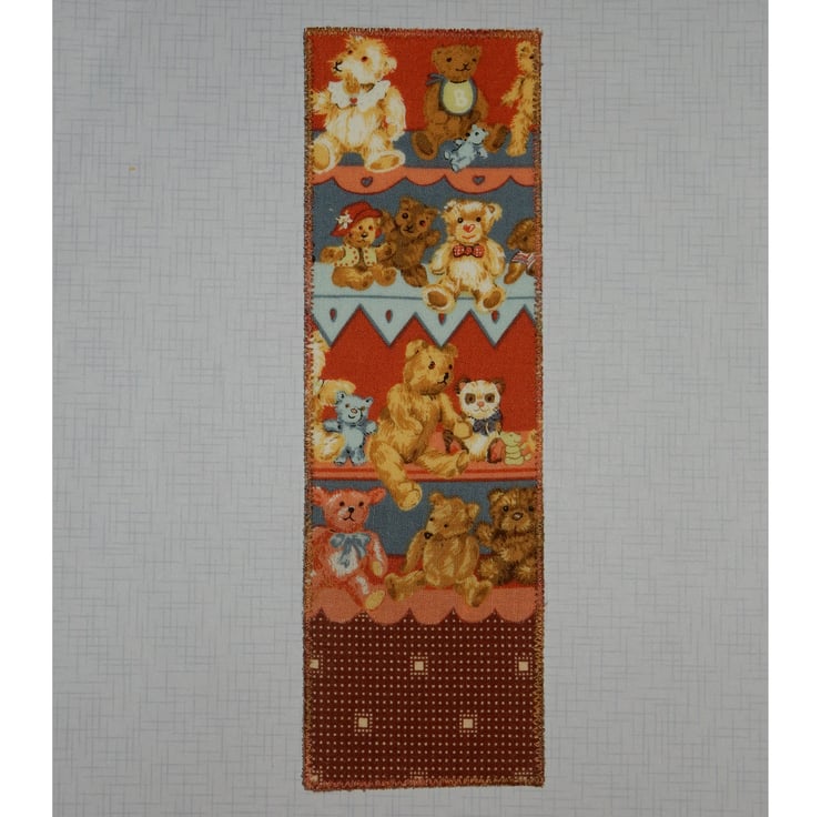 Cute cuddly traditional teddy bears sitting on shelves, feature on this bookmark, together with a toning brown print fabric. The edge is stitched in matching thread.