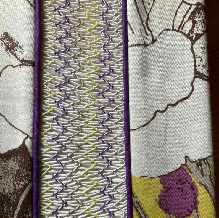 The smocking is worked on a narrow band of white fabric and the pattern worked as the mood takes and in response to the fabric, so will not be repeated.