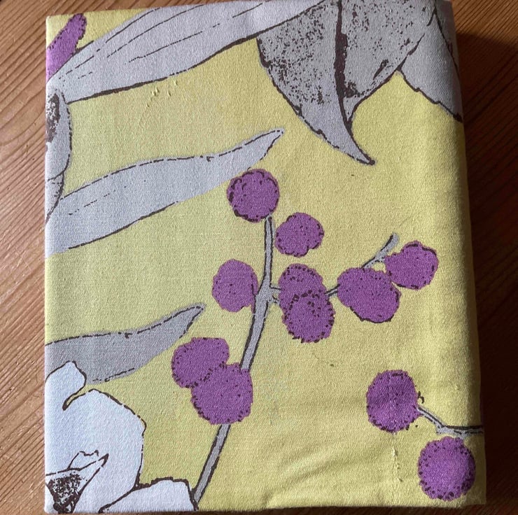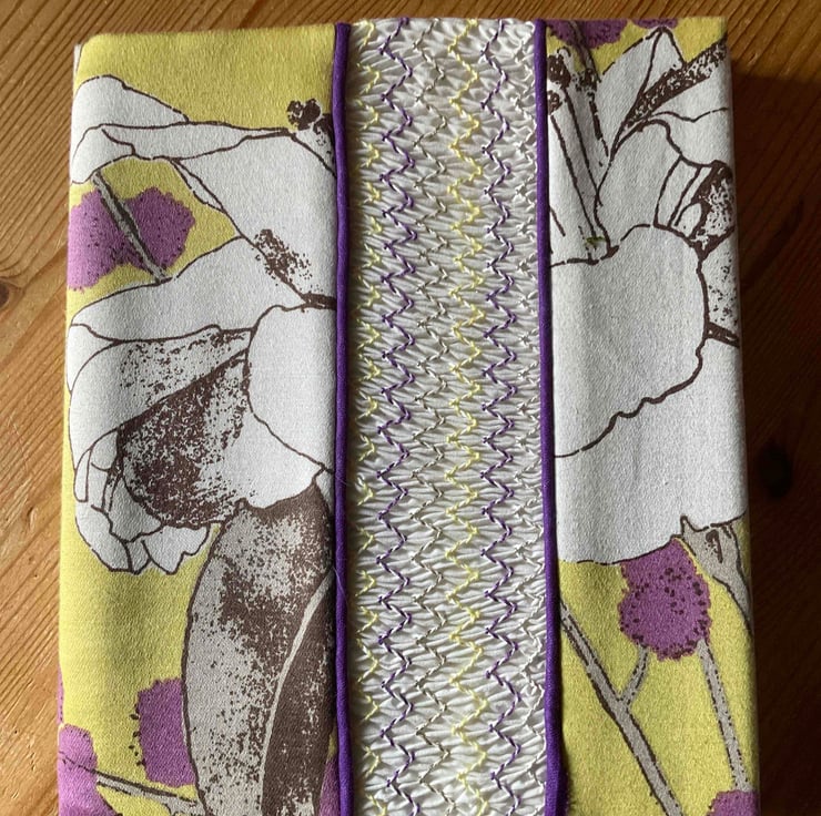 This useful journal is covered in a fabric slip cover which features an inserted strip of smocking which has been worked in toning colours and is edged with purple piping.