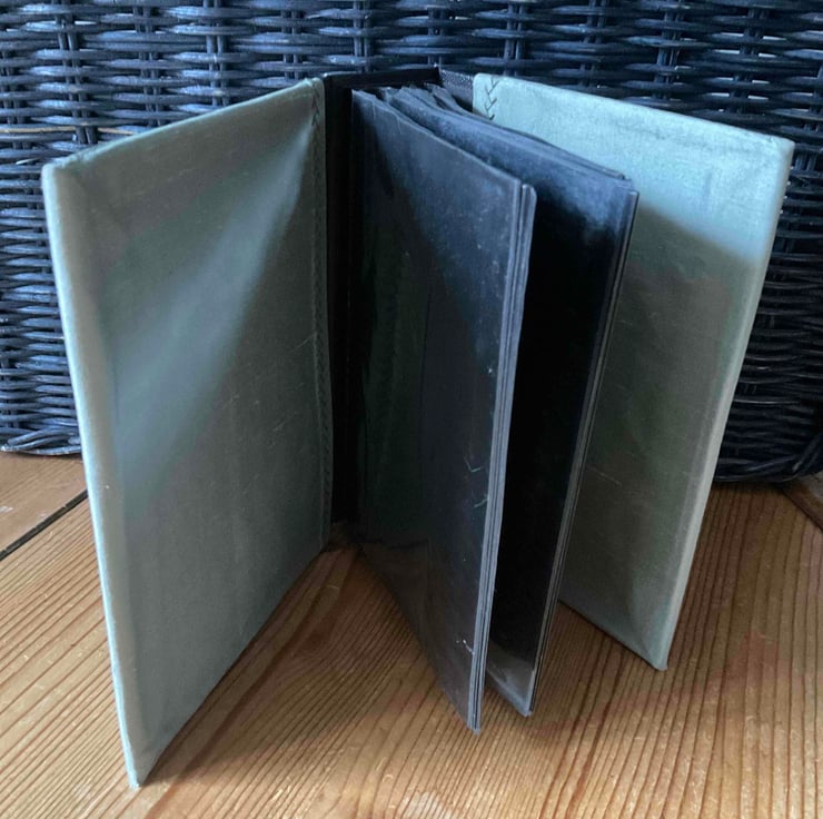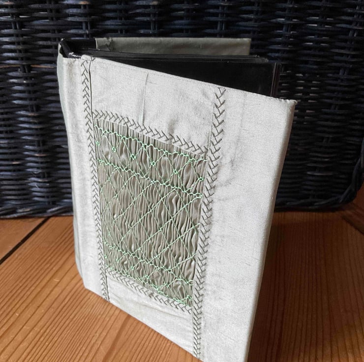 This beautiful photograph album has a slip cover featuring a hand smocked inserted panel in a pistachio shade of green silk and is ideal for holding the memories of a special occasion for example a wedding or anniversary. It would make a wonderful gift.
