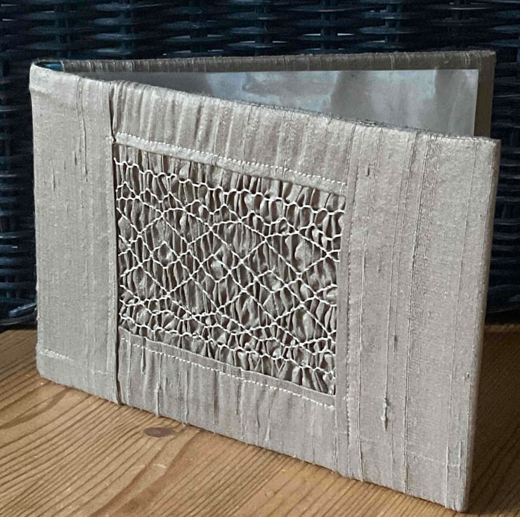 This beautiful photograph album has a slip cover featuring a hand smocked inserted panel in a coffee shade of Dupion silk and is ideal for holding the memories of a special occasion for example a wedding or anniversary. It would make a wonderful gift.