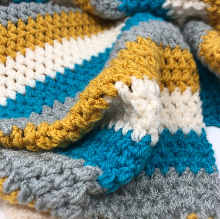 This lovely scarf has been crocheted using a bobble type stitch to give it some texture. It measures just over 20cm wide and just over 180cm long so there is plenty of it to wrap around. I’ve used grey, cream, mustard and teal, a perfect combination for those Autumnal walks. Machine washable at 30 degrees and dry flat.
