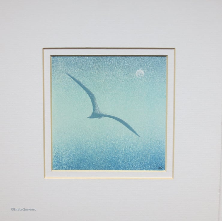 A single gull gliding on a summer breeze at twilight - original monoprint.