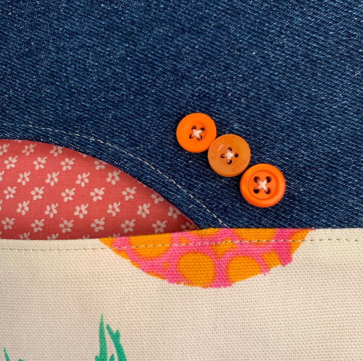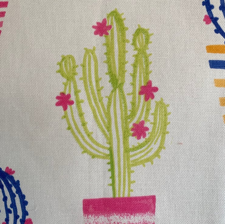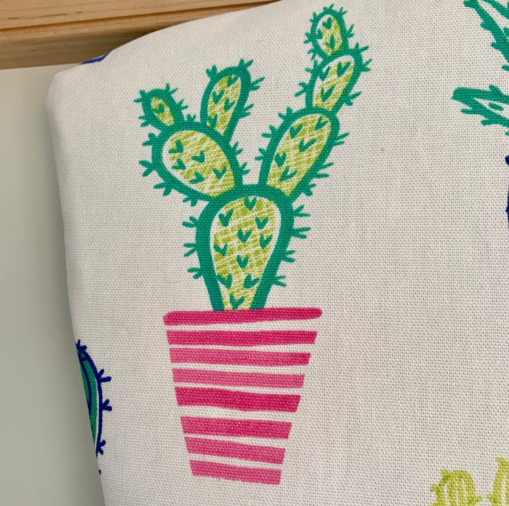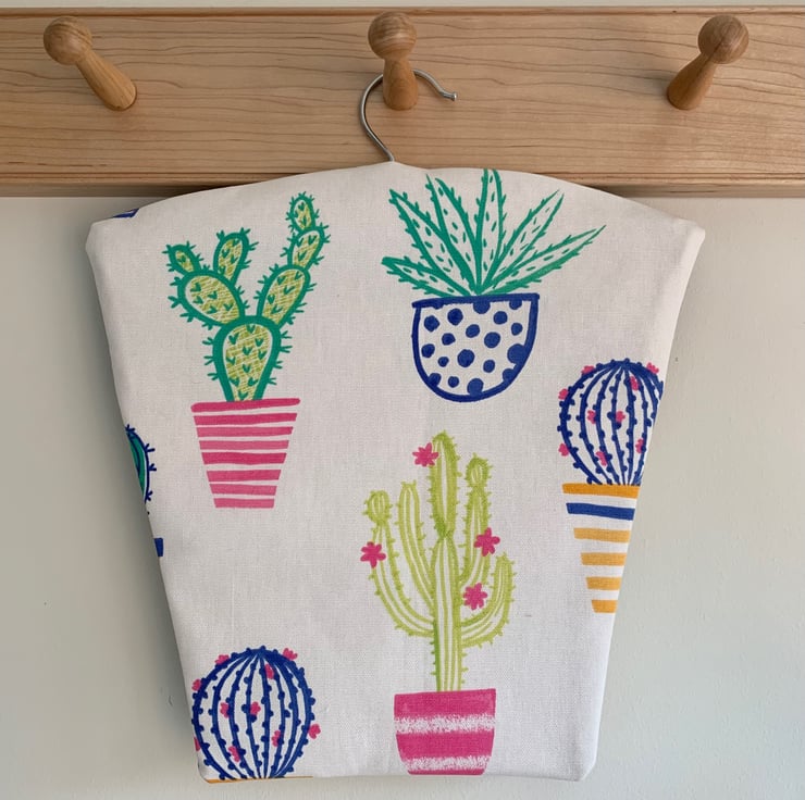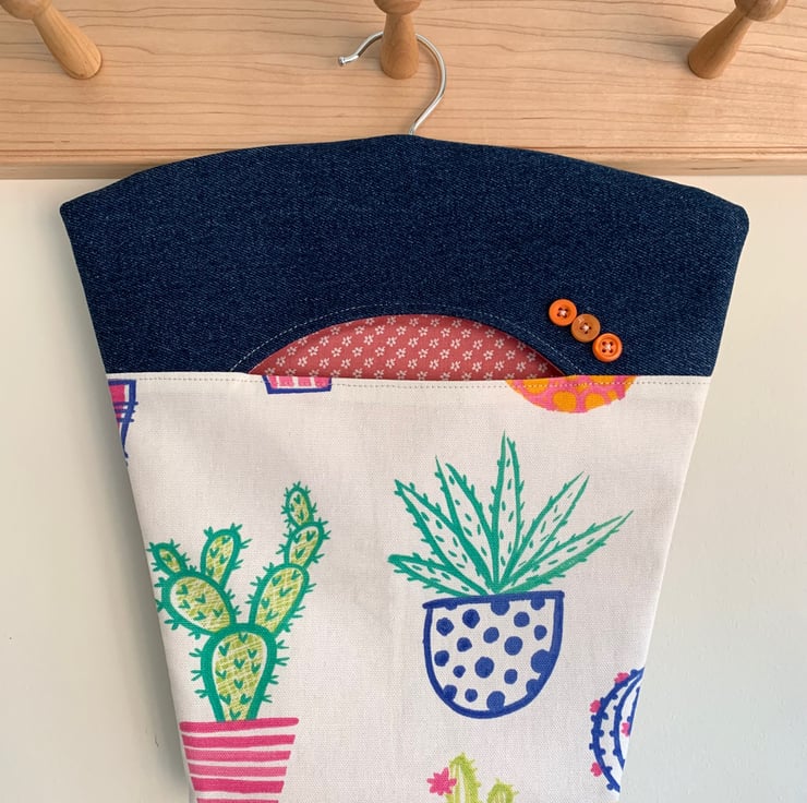 Peg bag made from cactus print cotton and reclaimed denim. Fully lined with pretty pink floral cotton reclaimed from a tablecloth. It hangs from a strong wood and metal hanger.