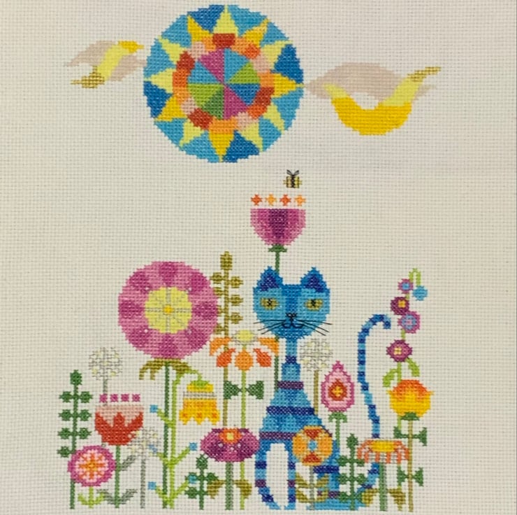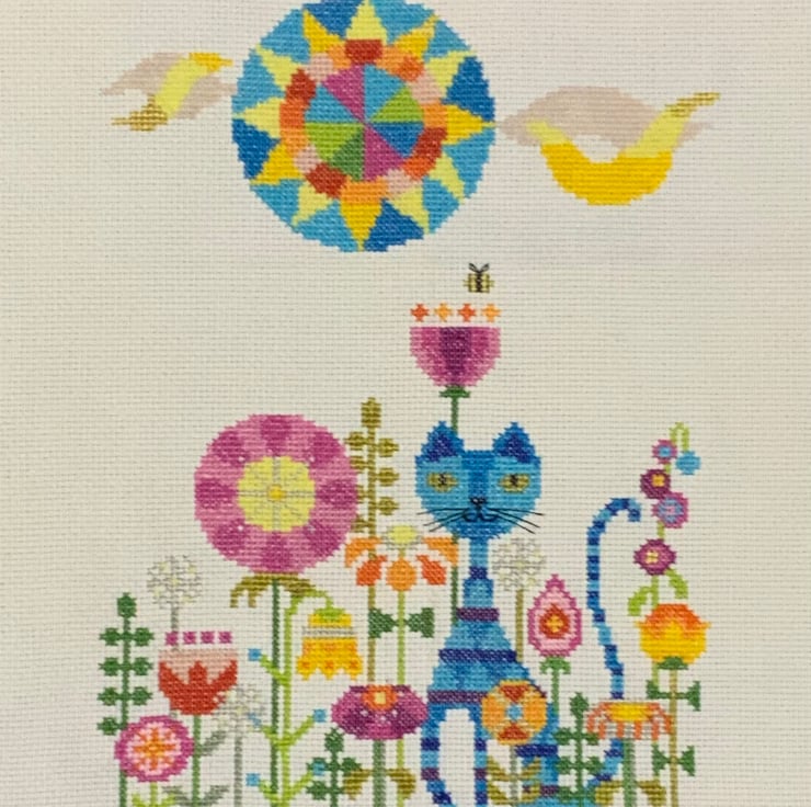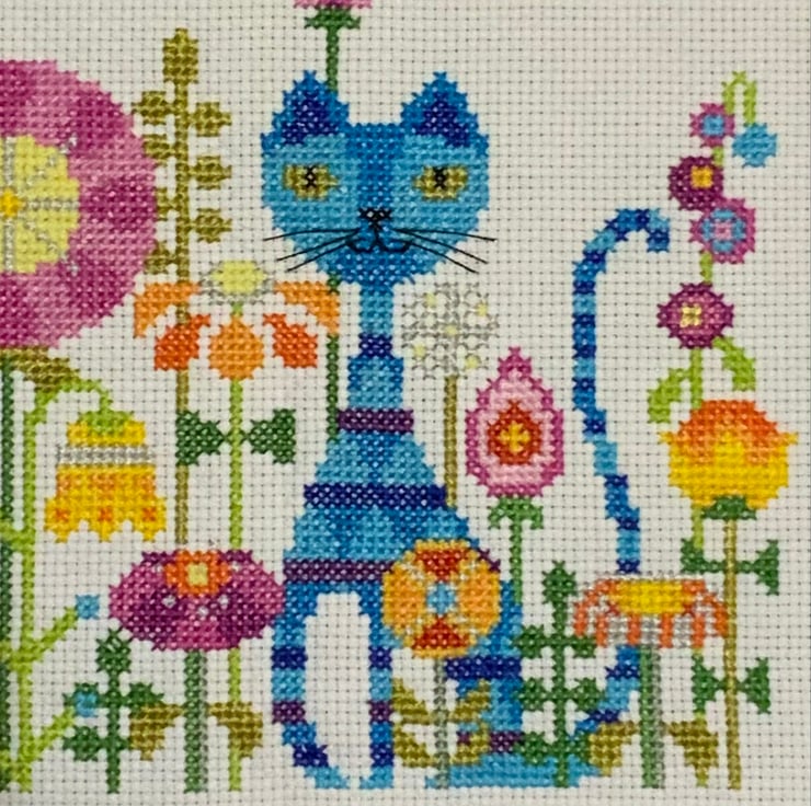 Fun, bright, modern completed cross stitch featuring a Blue cat within a garden of colour. Stitched in DMC threads, completely by hand, on to a base of Cream Aida in 14ct (14 stitches per inch).