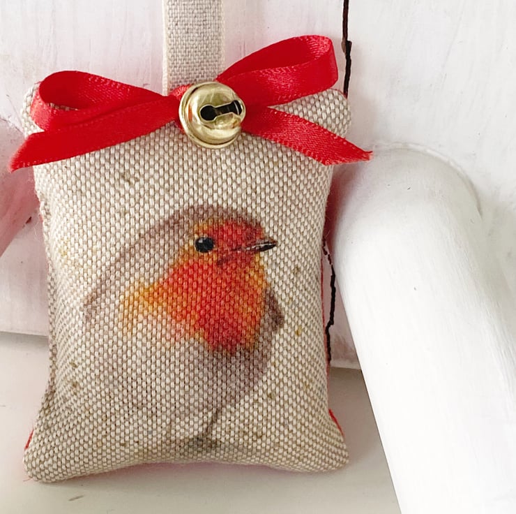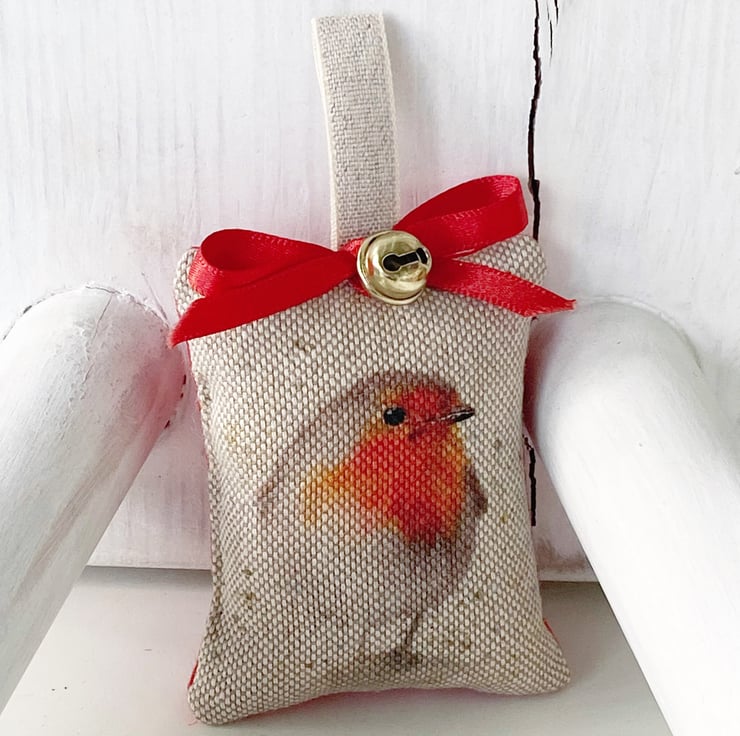 - features a gorgeous fluffy robin on taupe linen-look cotton plus festive white stars on bright red cotton on the reverse side.