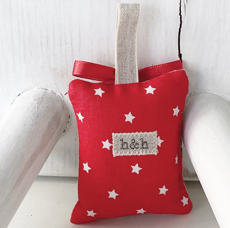 Handmade decoration has a shiny gold jingle bell, a red satin ribbon bow and a linen tape hanging loop and is generously filled with toy-grade stuffing and whole cloves for a subtle but spicy Christmas aroma.