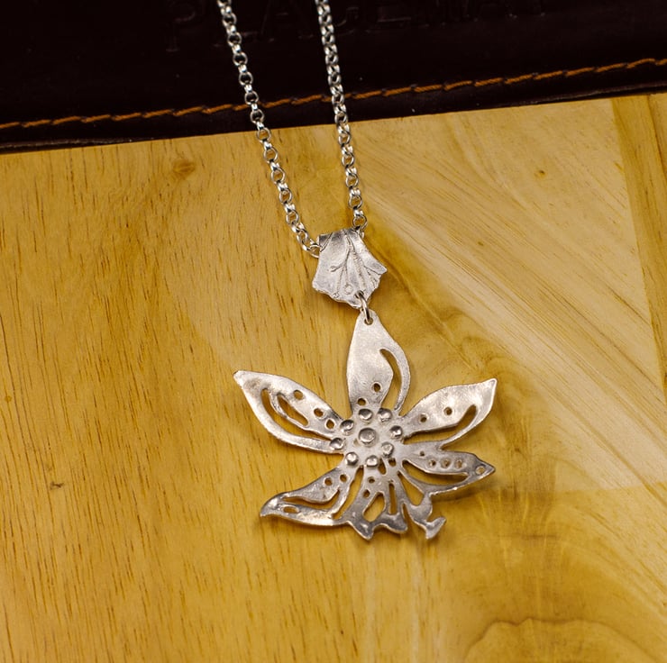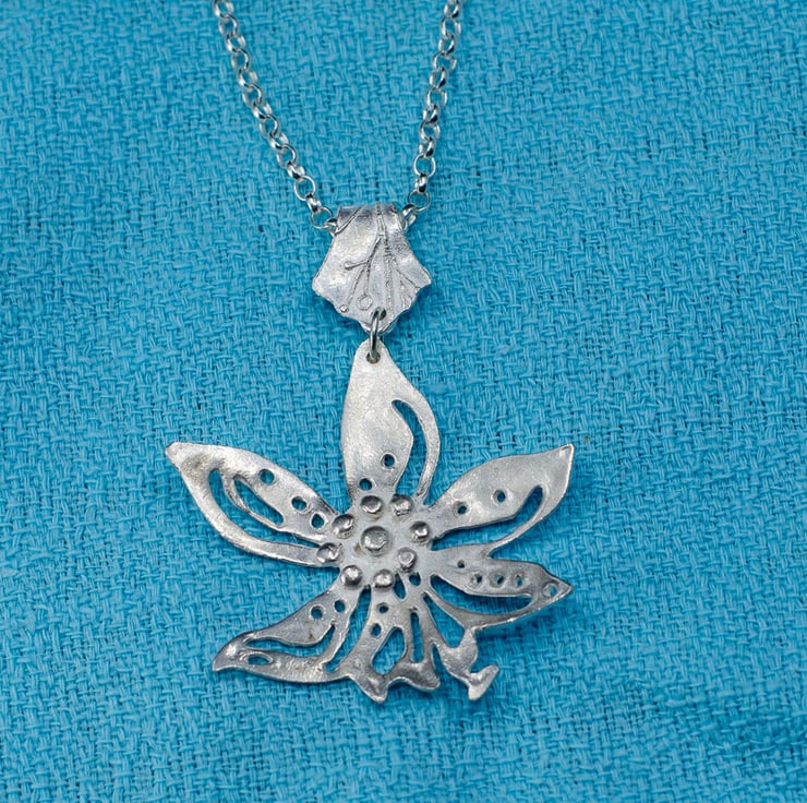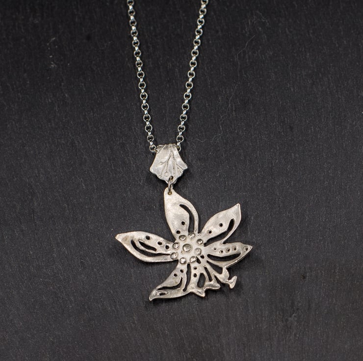 This pendant was hand made using the silver clay technique. At its widest point it measures 4.5cm and comes with a 18in/45cm sterling silver chain