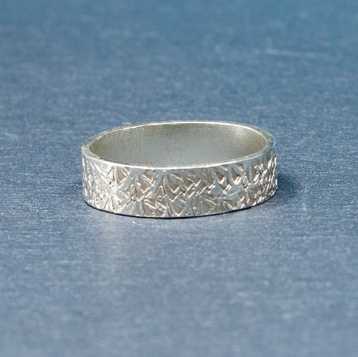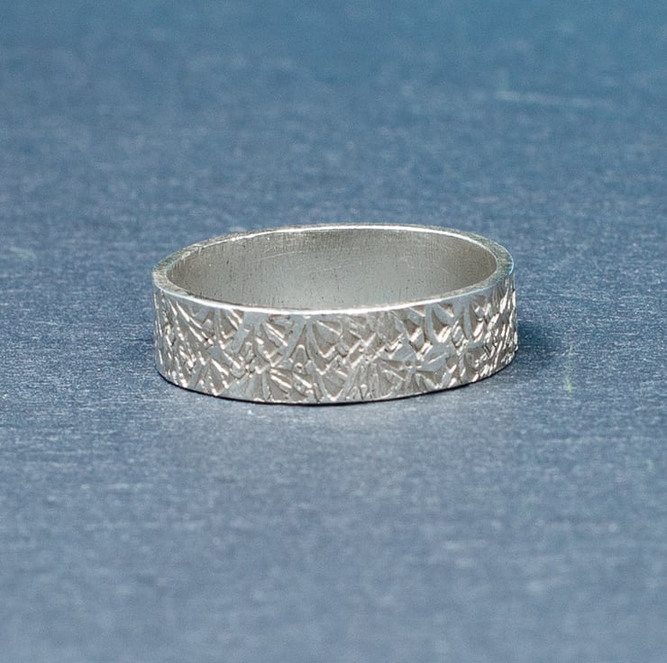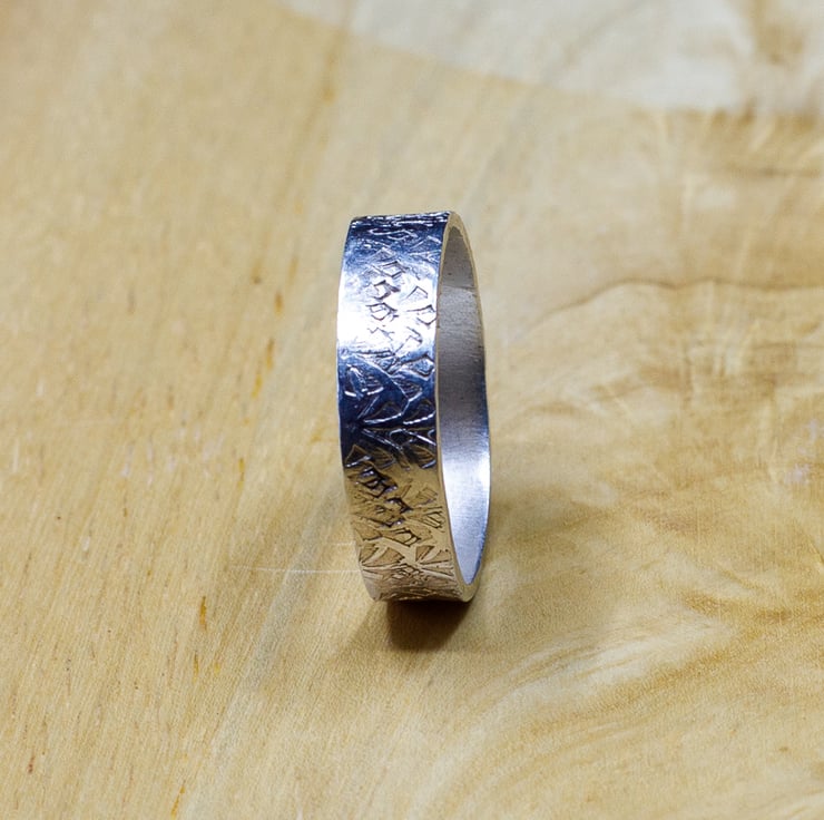 This ring is hand made of sterling silver with an abstract pattern on it.