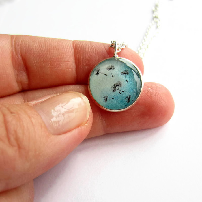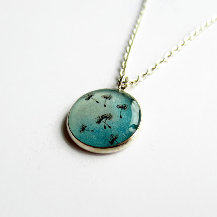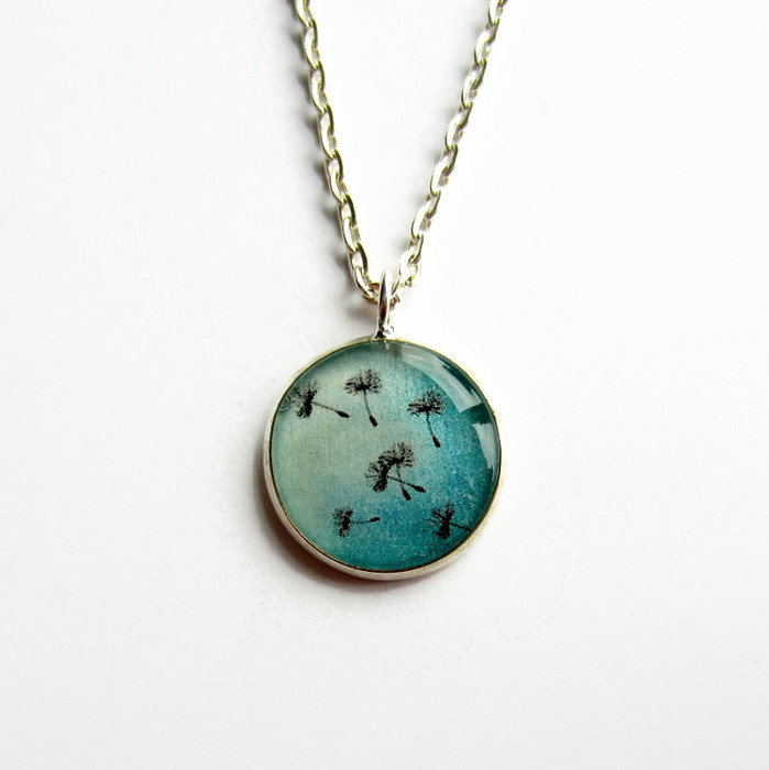 This pretty little pendant necklace features a picture of dreamy, floaty dandelion seeds on a turquoise blue background set beneath a layer of glossy, hand poured resin.