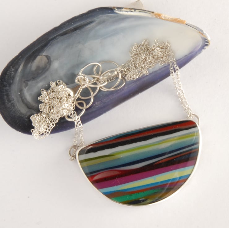 This statement necklace features a semi circle of colourful surfite which is bezel set in sterling silver and then suspended within a sterling silver chain. The surfite has horizontal stripes in shades of blue, green red and an unusual purple band. The chain the surfite hangs within is a fine trace chain but I've doubled it up to support the weight of the pendant, I like the way the strands move over each other and catch the light. The chain is 18 in (plus 2 in extender) with the surfite making up part of that length, the surfite measures 37mm by 24mm drop. The necklace comes in a sleek black box.