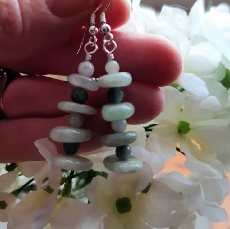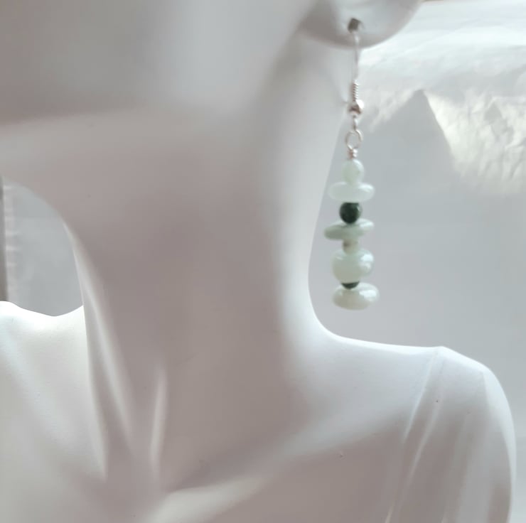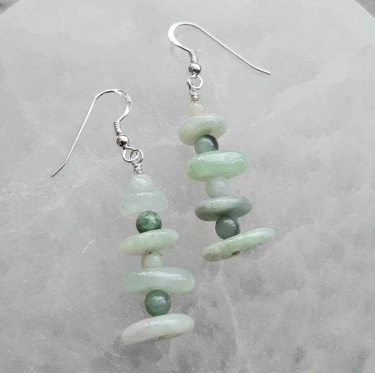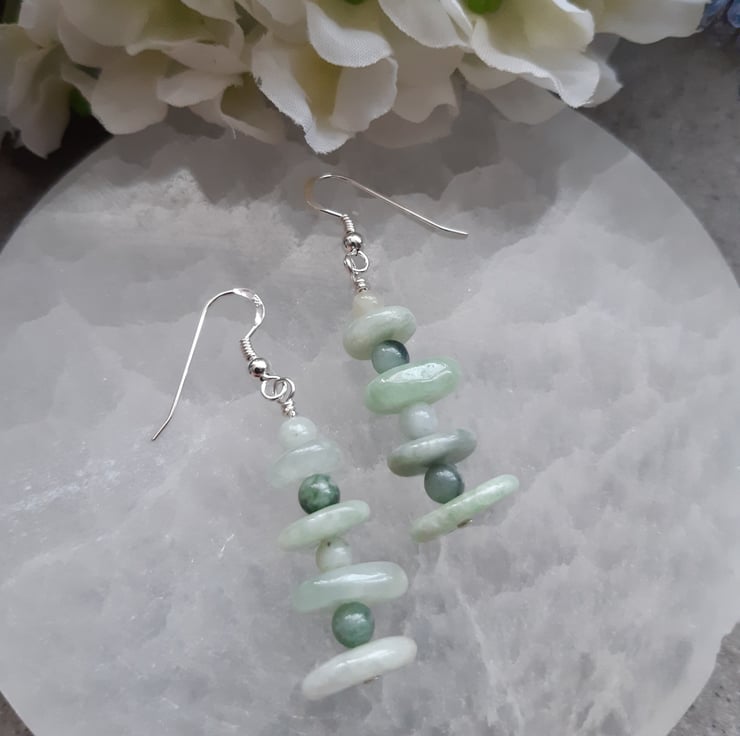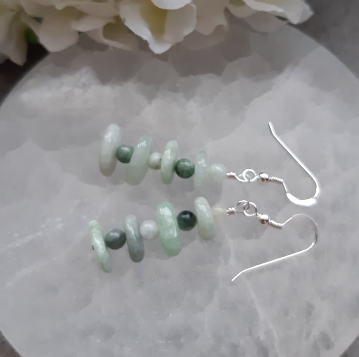 These lovely drop earrings are made using jadeite small rounds and slice shaped gemstones and sterling silver