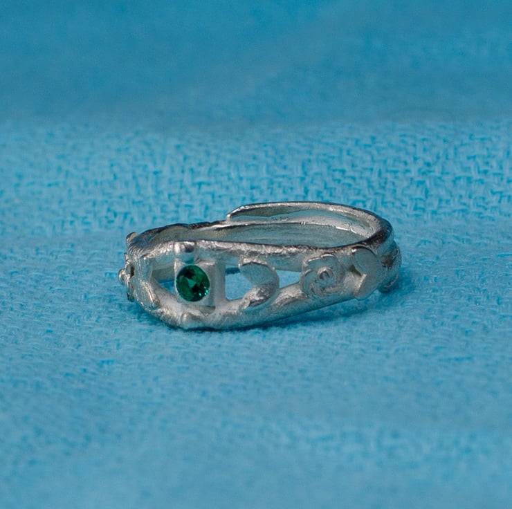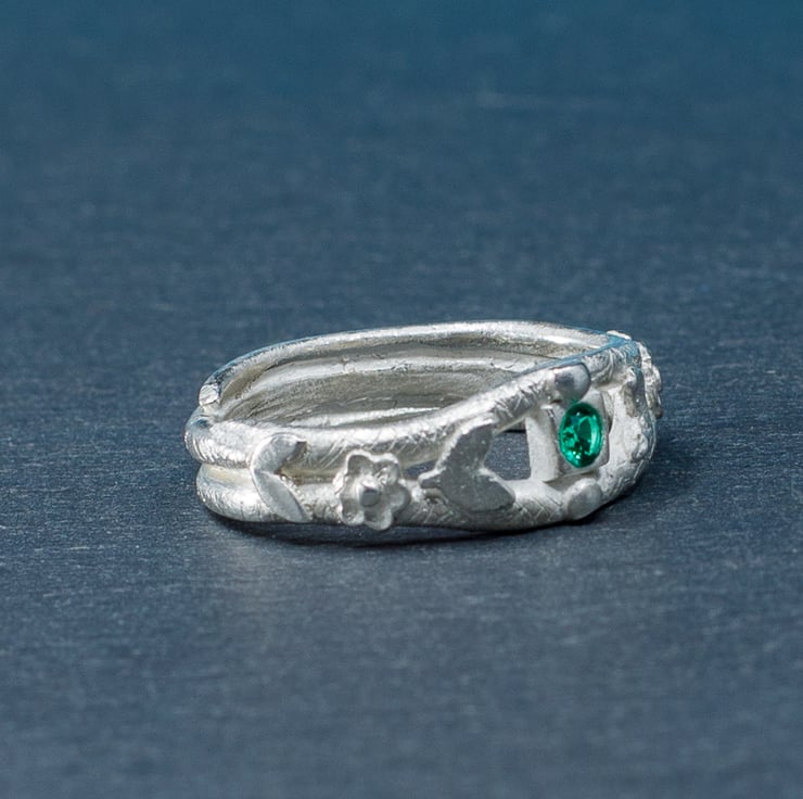 This ring has been hand made using the silver clay technique. It is styled like a wrap around twig decorated with leaves and flowers. It has a green cubic zirconia stone mounted at its centre.It is size R.