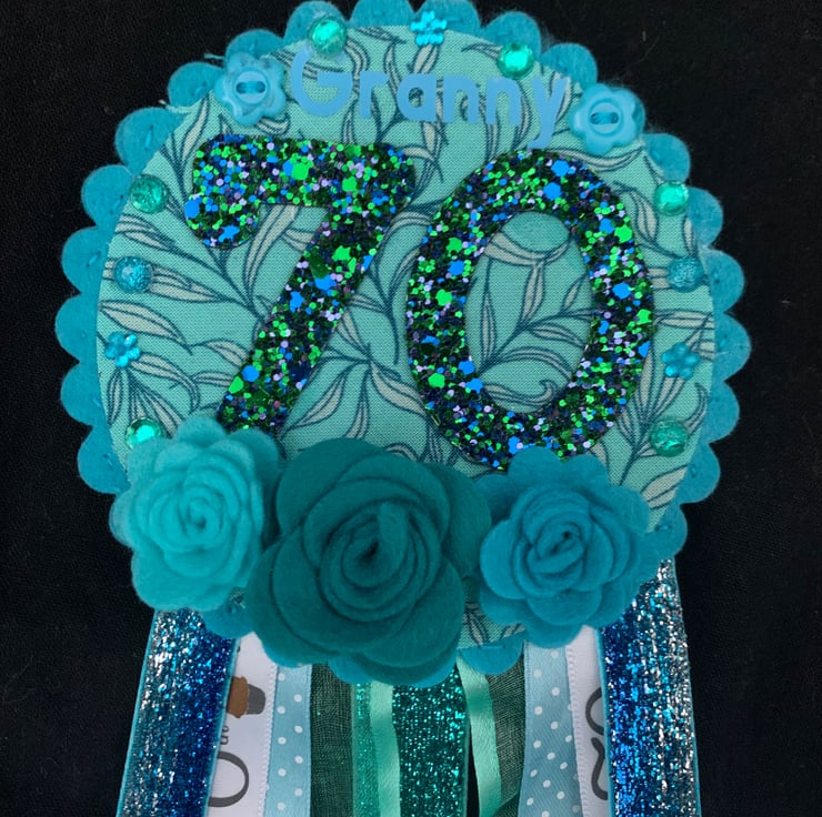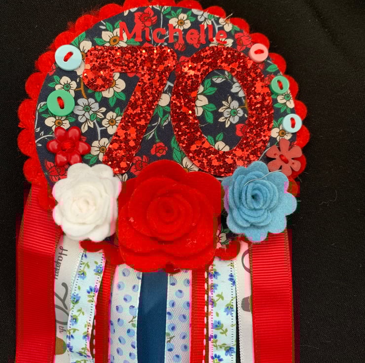 Birthday badges made in felt/fabric, many designs in any colours 70th birthday pretty red floral and pink/black paisley design