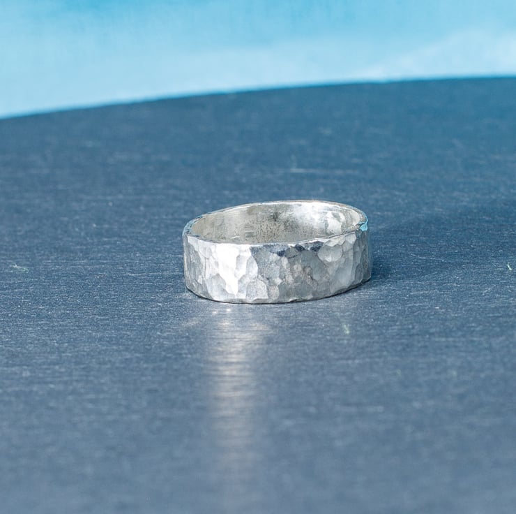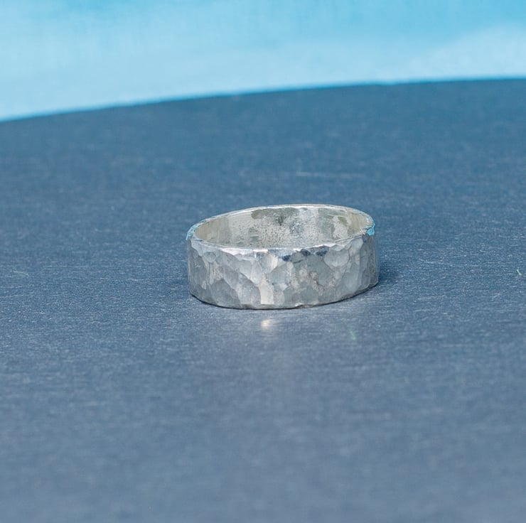 This ring was hand made from sterling silver sheet finnished with a hammered pattern. It is size N.