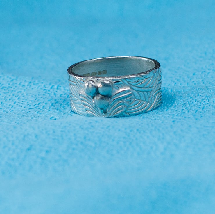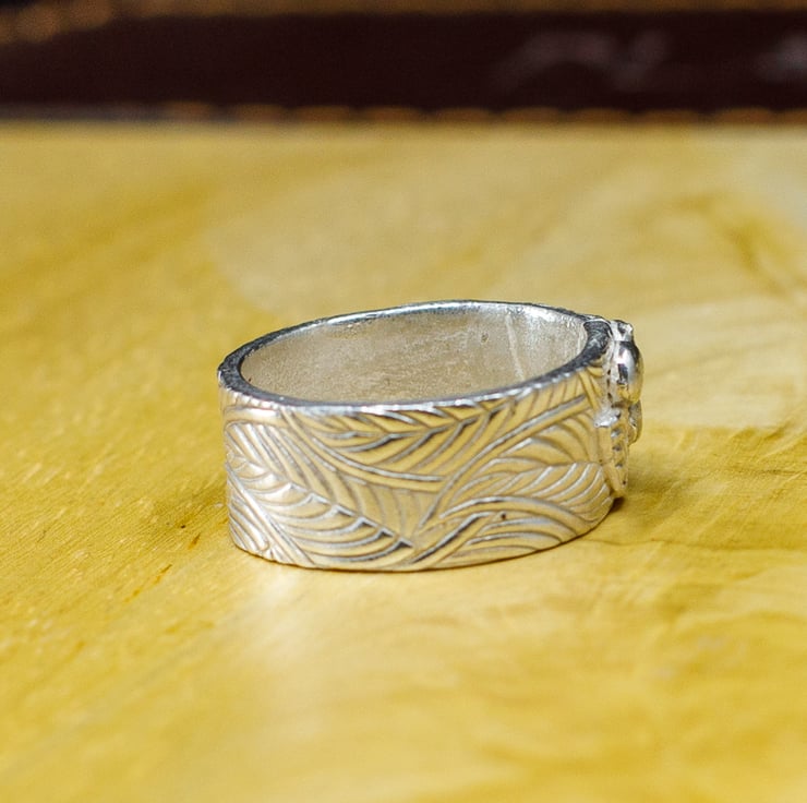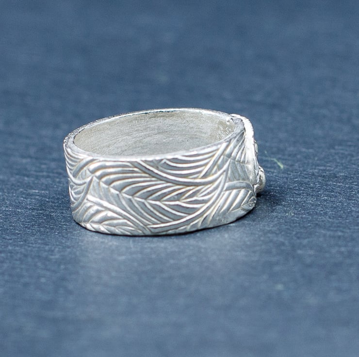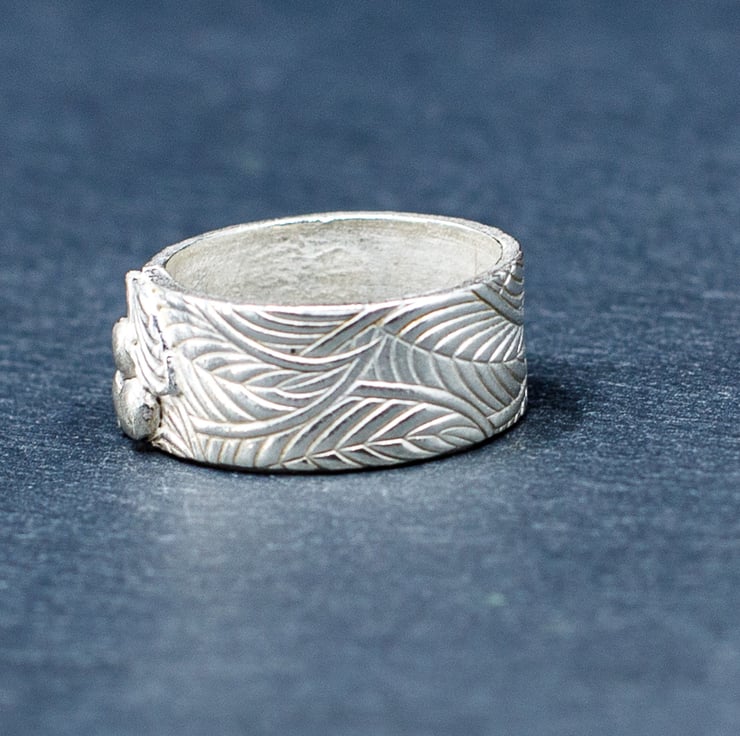 This is wide ring (10mm) made using the silver clay technique. it has an overall leaf pattern and two silver leaves and three silver dots overlaid on it. It is size Q1/2.