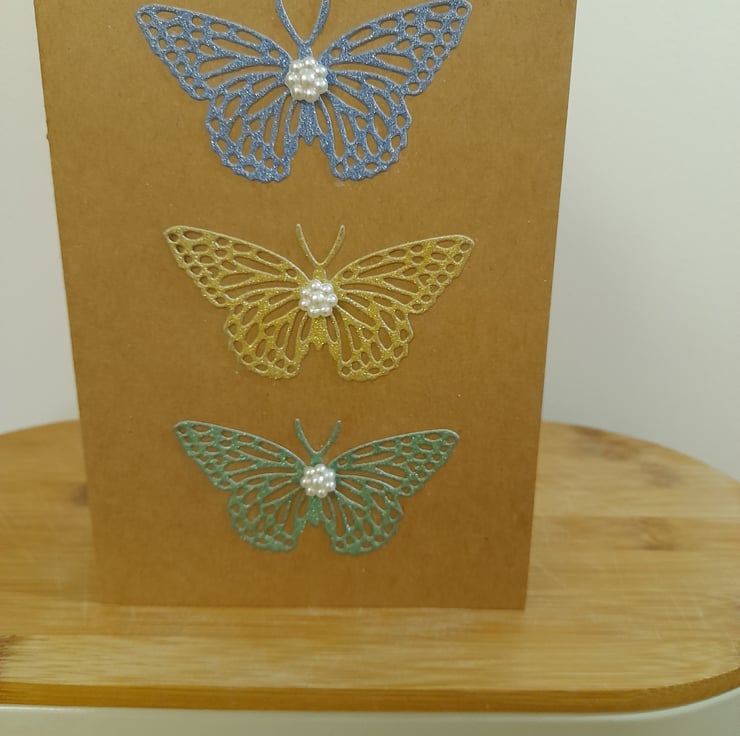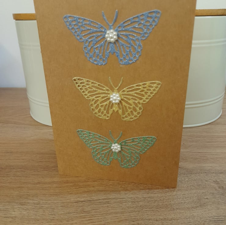 LOVELY HANDMADE BUTTERFLY GREETING CARD, MADE USING RECYCLED KRAFT COLORED CARD, WITH THREE HANDMADE GLITTER DIE CUT GLITTER BUTTERFLY'S IN BLUE, GREEN AND GOLD ALONG WITH SMALL PEARL FLOWERS. THE CARD MEASURES 5" x 7" AND WILL COME WITH A KRAFT ENVELOPE AND BOTH IN A CELLOPHANE BAG. THE CARD WILL BE BLANK FOR YOUR OWN SPECIAL MESSAGE FOR A SPECIAL PERSON.