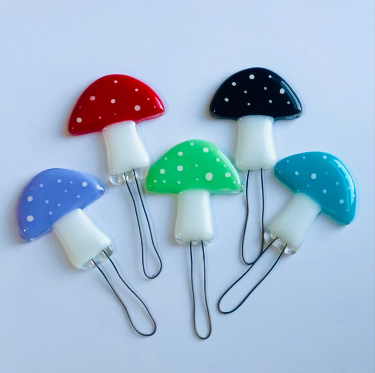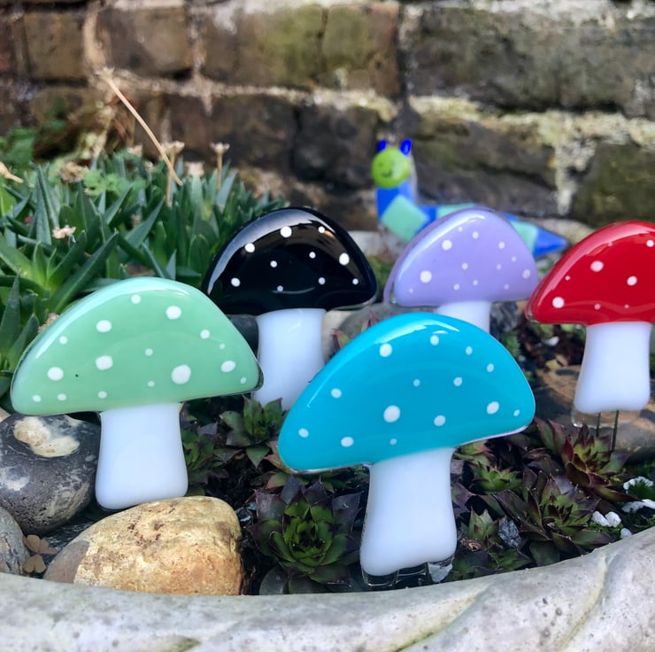 Handmade fused glass mushrooms each one unique and come in a variety of colours and sizes .
