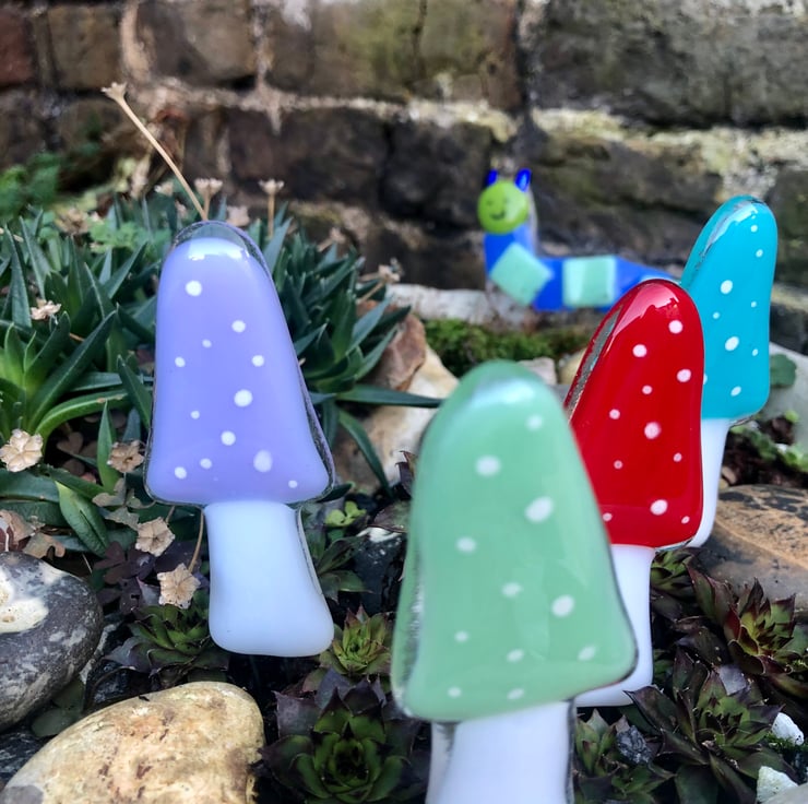 Handmade fused glass tall mushrooms each one unique and come in a variety of colours and sizes .