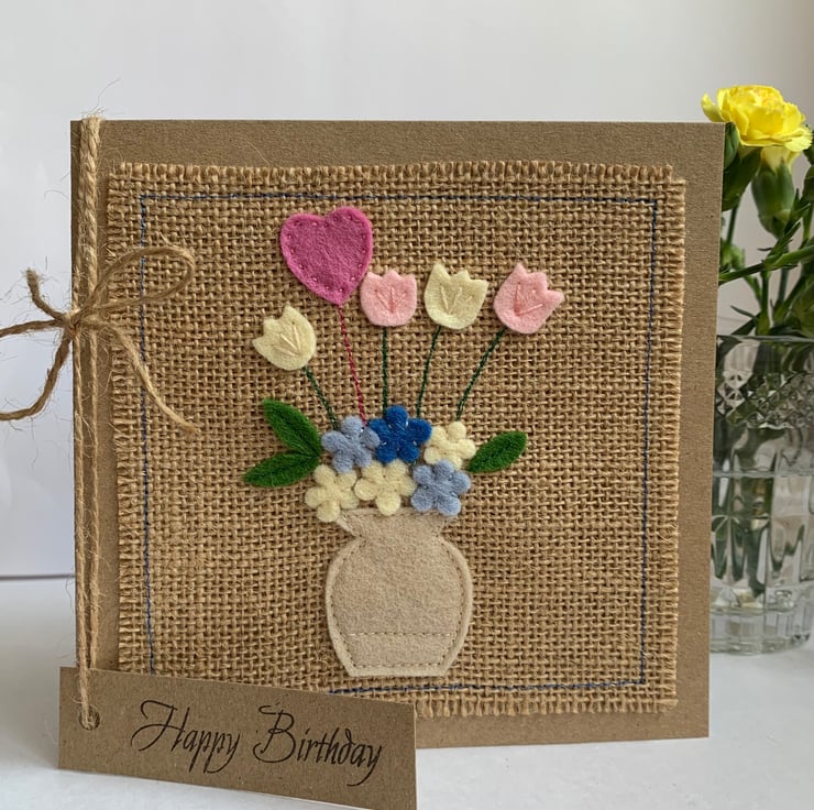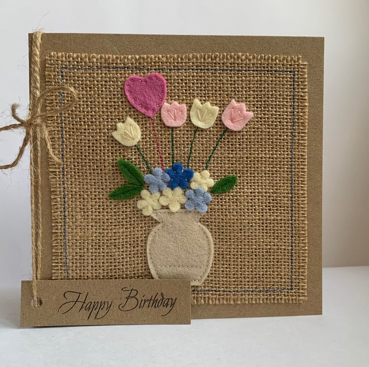 This greetings card is decorated with a vase of pink, cream and blue flowers with a rose pink heart. The decoration is hand cut from 100%wool felt. It is then sewn by hand and machine onto a hessian background.
