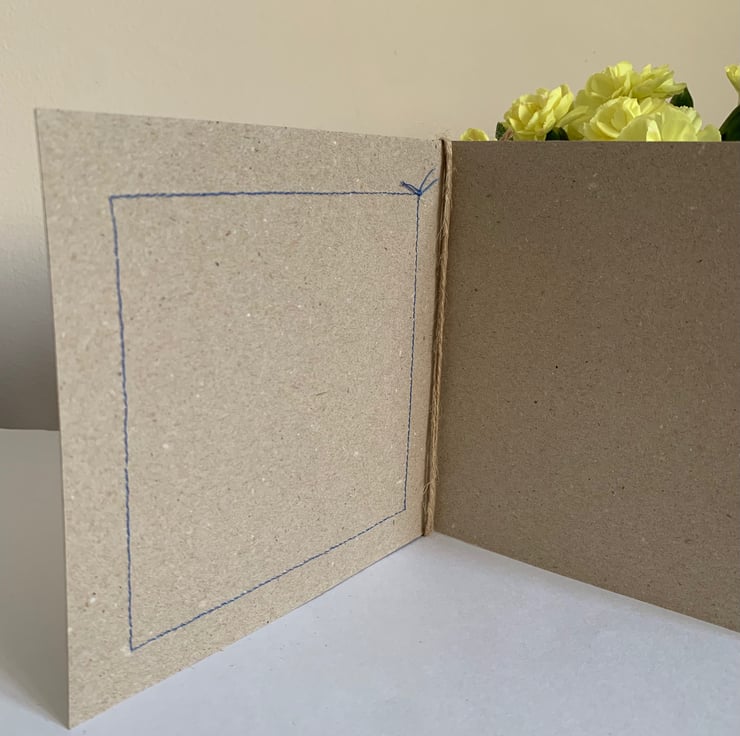 The hessian is machine stitched, using a contrasting thread, onto a plain brown recycled card. This stitching is visible on the inside of the card.