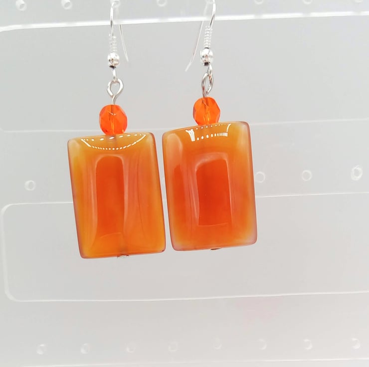 This pretty orange beaded 2 piece jewellery set comprises a necklace and a pair of earrings. It is made using 25 mm x 20 mm orange rectangular beads,6 mm orange faceted crystal beads and a variety of different sized orange beads, including some peach and white striped heart beads. It has one of the rectangular beads with an orange faceted crystal as a pendant which is suspended on a silver plated flower design bail. The earrings have silver plated hook ear wires and the necklace has a silver plated lobster clasp. The necklace measures 18.5 inches (47 cm), the pendant has a 1.5 inch (4 cm) drop from the base of the bail the earrings have a drop of 1.5 inches (4 cm) from the base of the ear wire. It will be dispatched wrapped in tissue paper in an organza bag and delivered via Royal Mail first class post. It would make a lovely gift for a fun loving lady for any special occasion and it would go well with any outfit for a casual day or evening out.